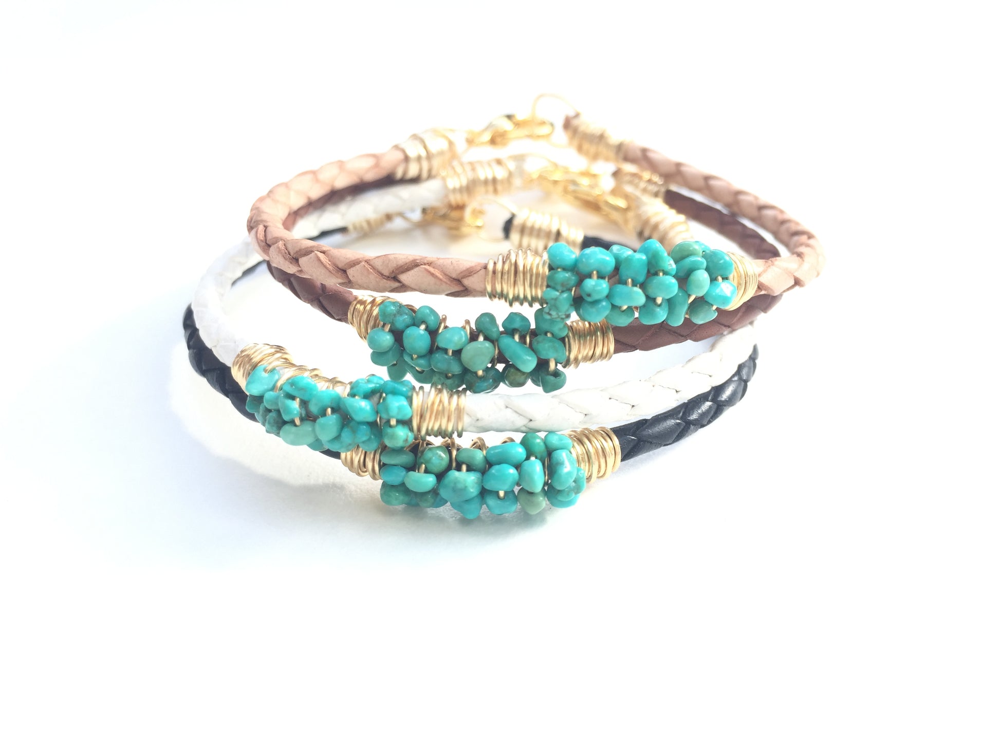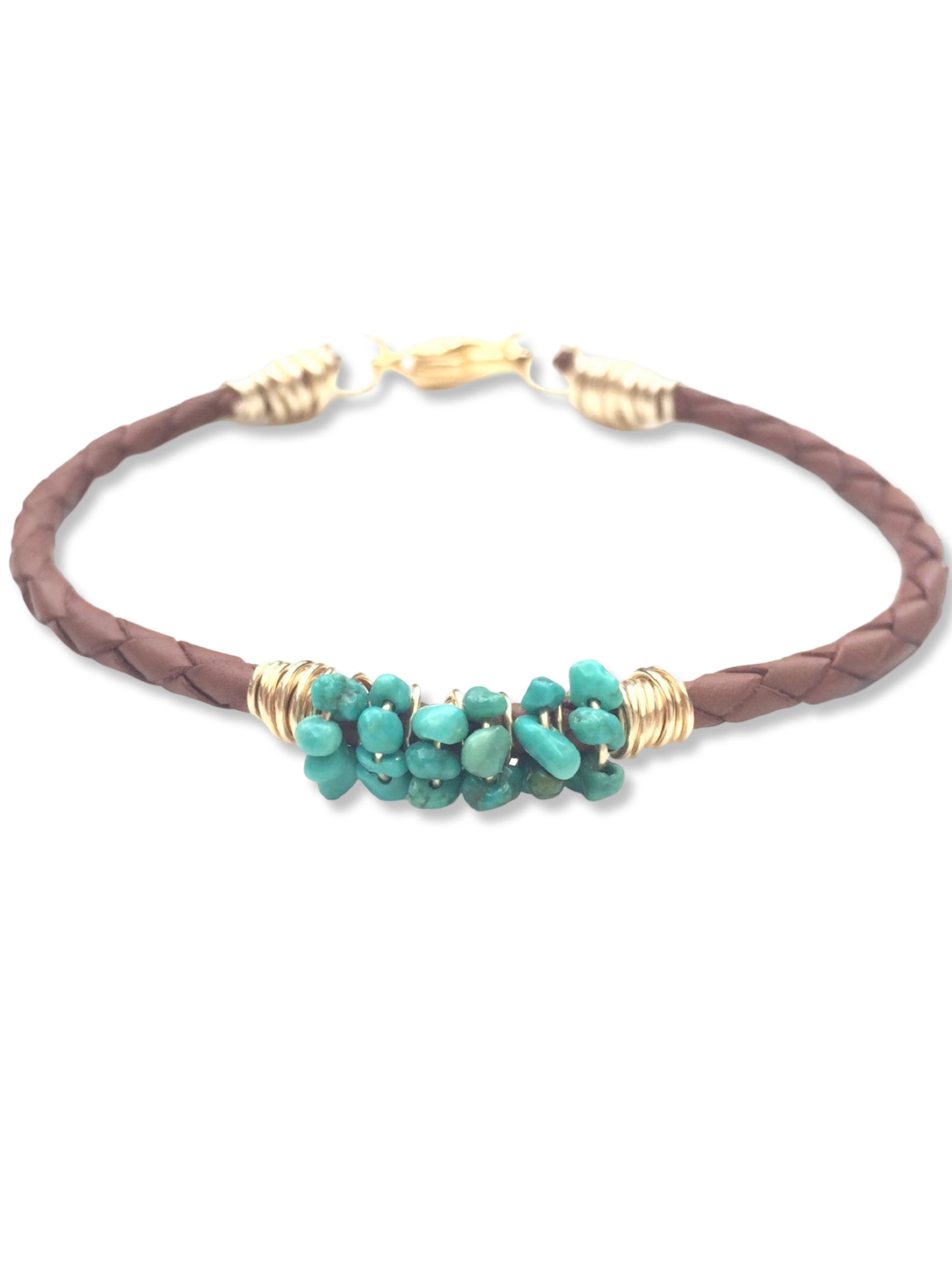 Turquoise wrapped onto Italian bolo cord leather, fastened with a lobster clasp.