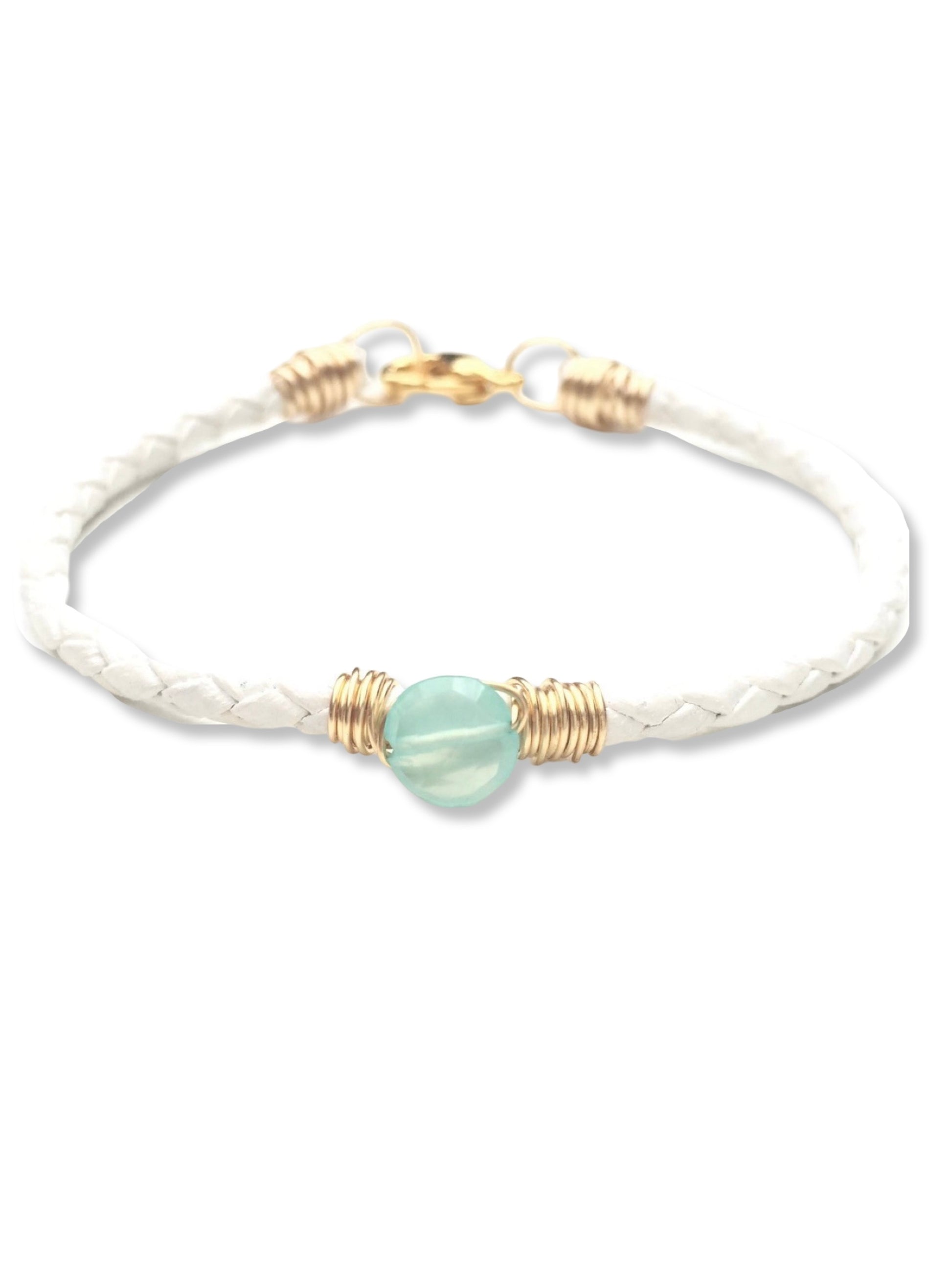 Chalcedony wrapped onto Italian bolo cord leather, fastened with a lobster clasp.
