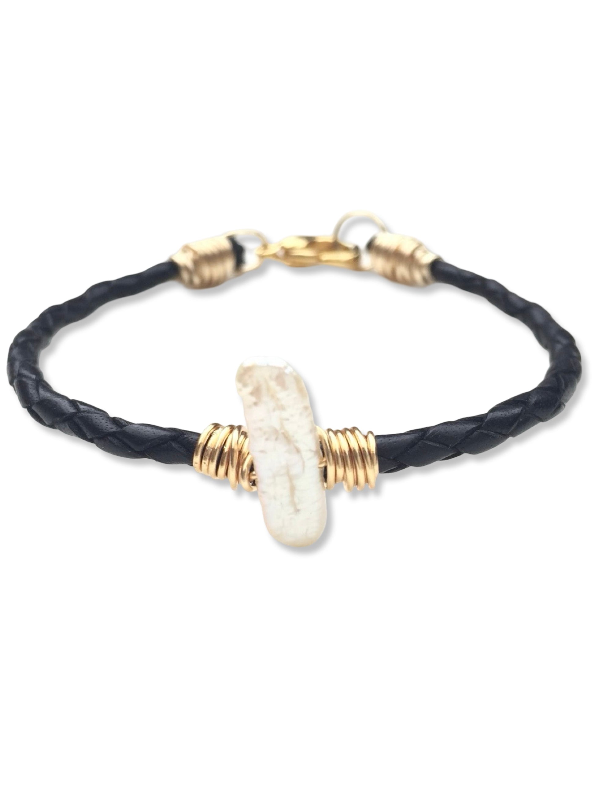 Freshwater pearl quartz wrapped onto Italian bolo cord leather, fastened with a lobster clasp.
