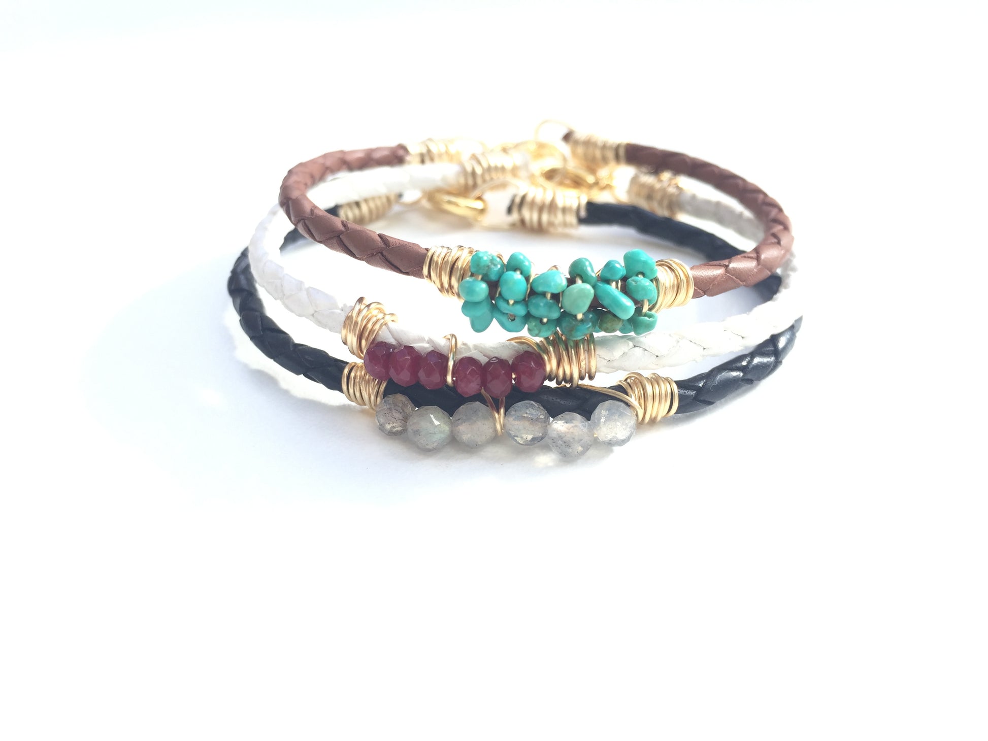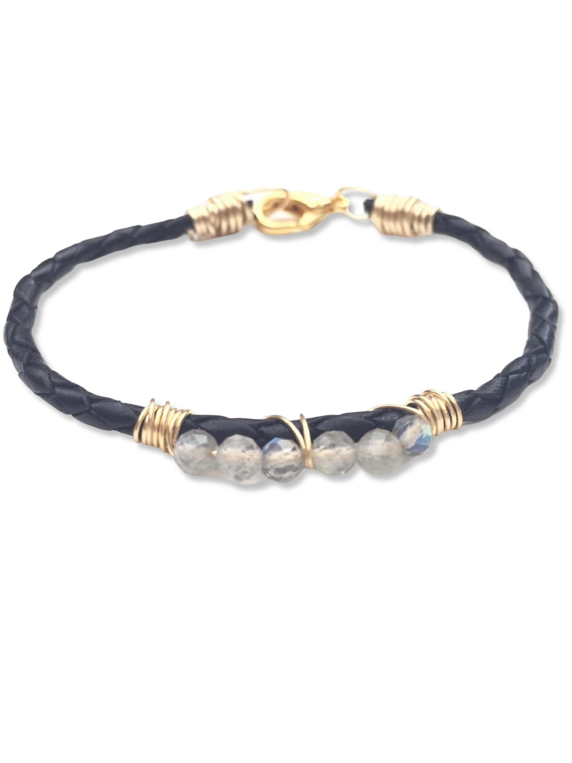 Labradorite wrapped onto Italian bolo cord leather, fastened with a lobster clasp.