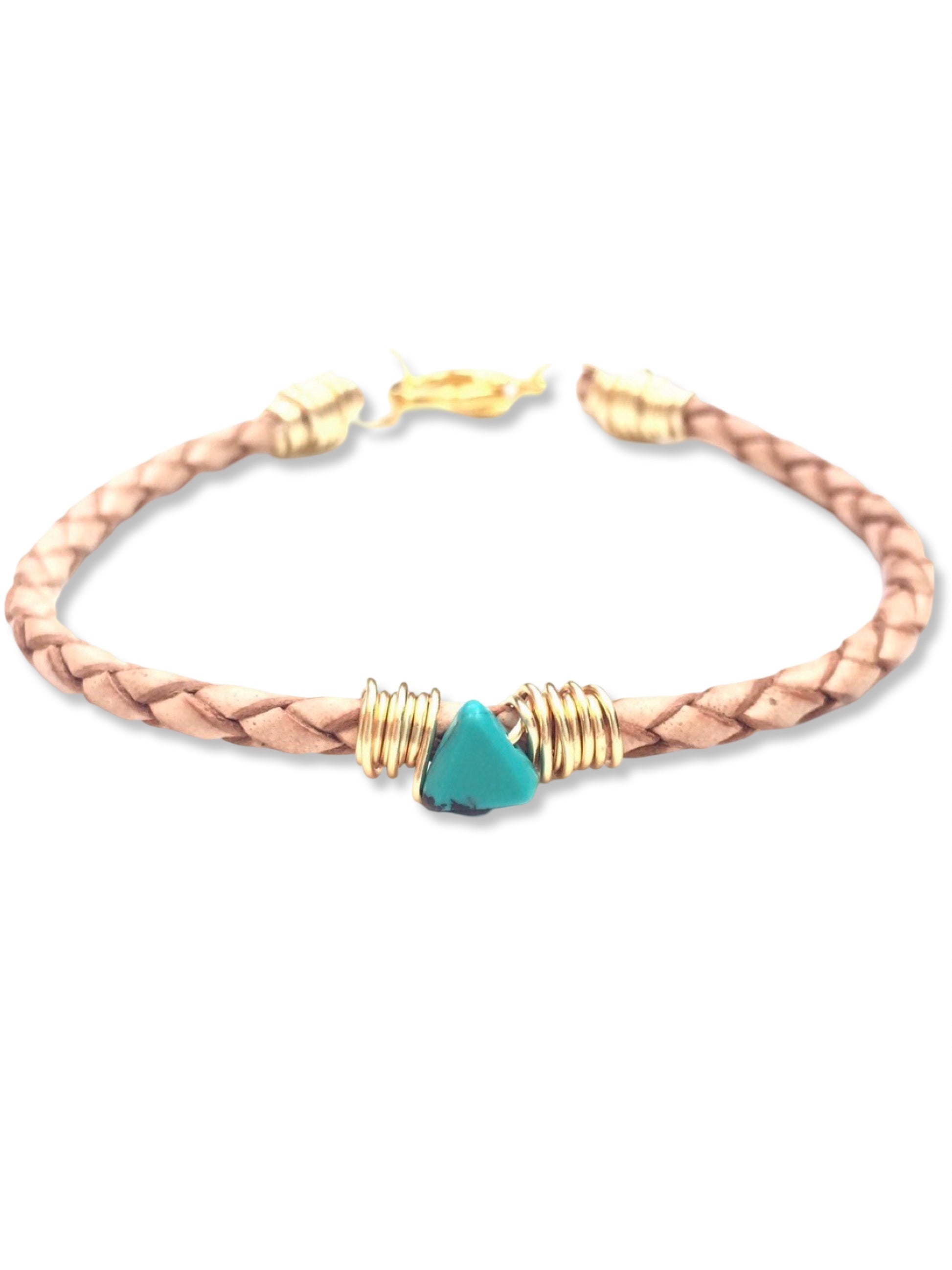 Turquoise triangle wrapped onto Italian bolo cord leather, fastened with a lobster clasp.