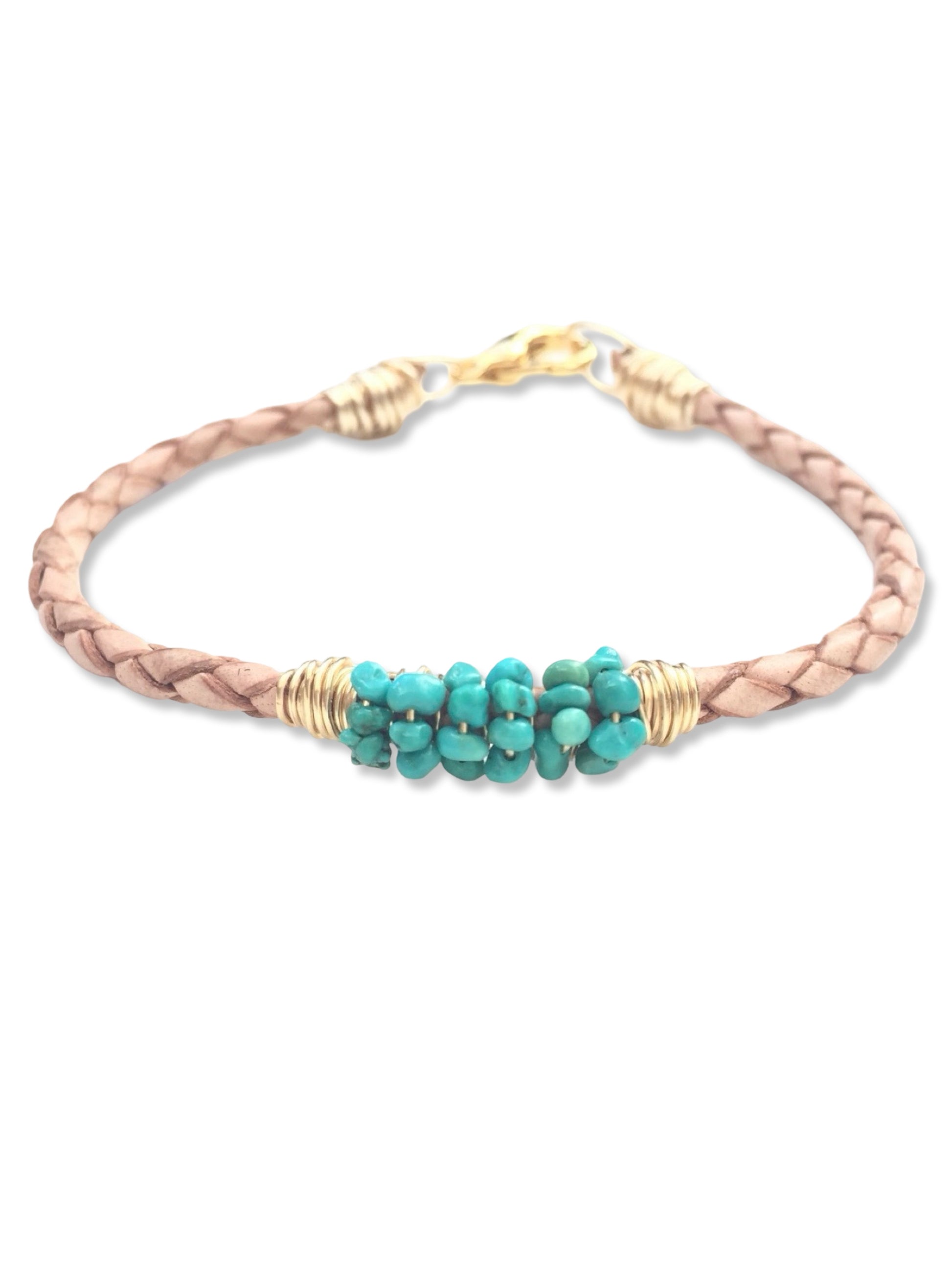 Turquoise wrapped onto Italian bolo cord leather, fastened with a lobster clasp.