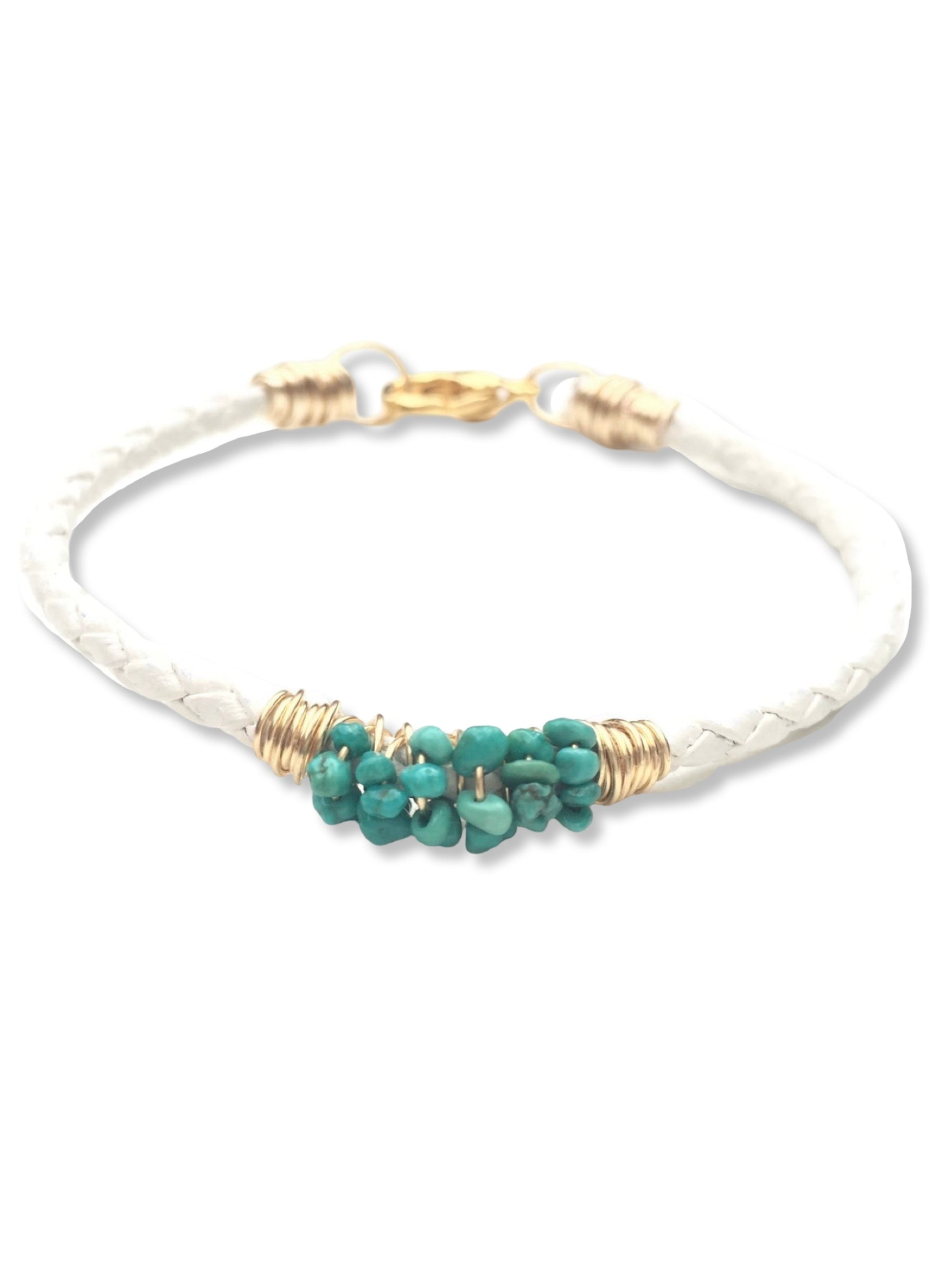 Turquoise wrapped onto Italian bolo cord leather, fastened with a lobster clasp.