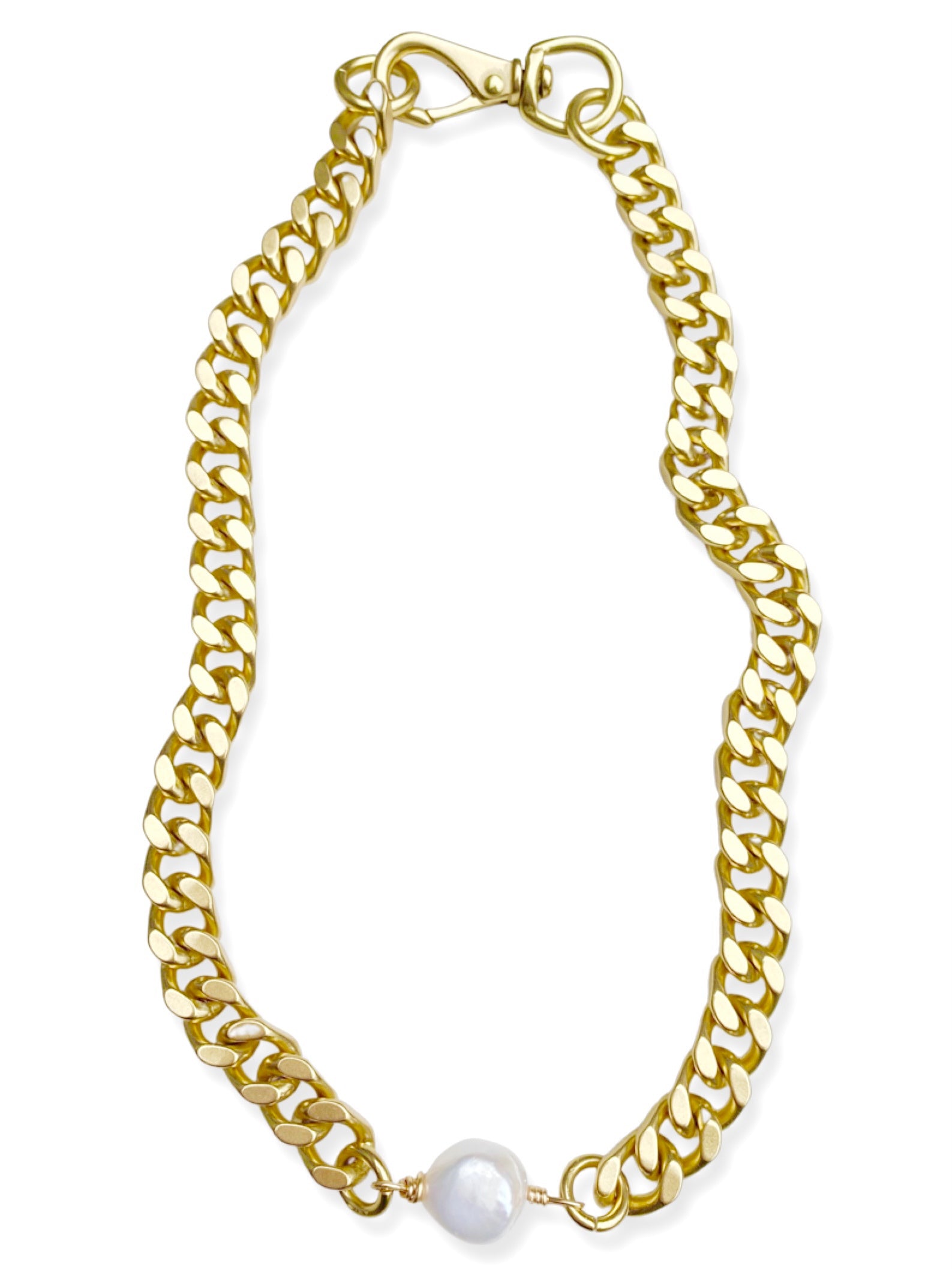 Chunky Brass Chain Necklace- Curb Chain w/ Pearl