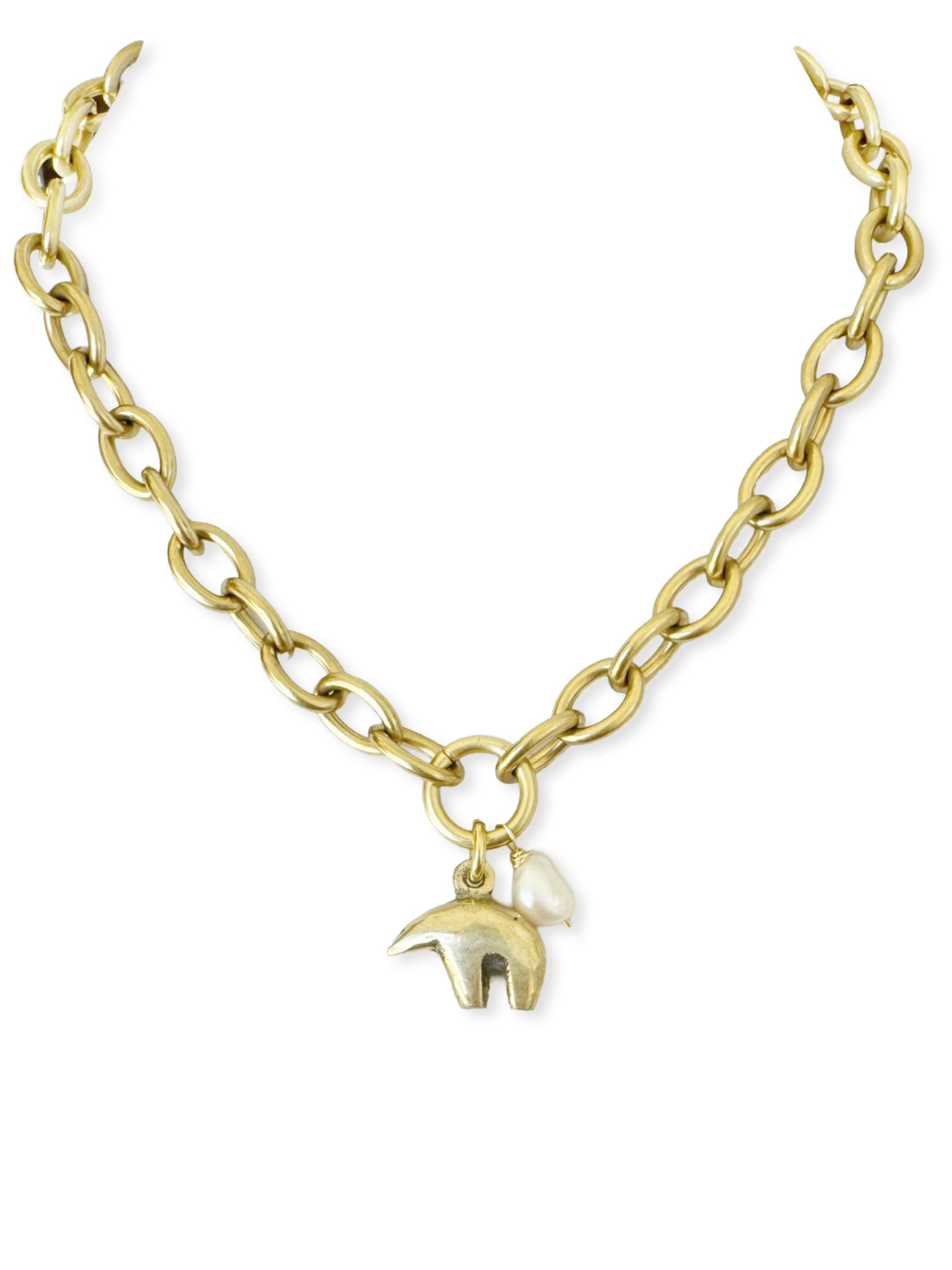 Chunky Brass Chain Necklace- Oval Chain w/ Bear