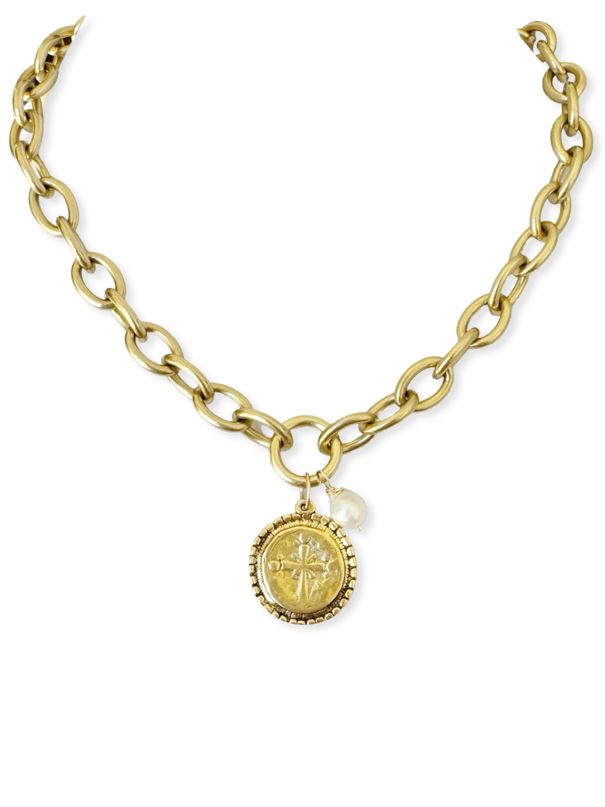 Chunky Brass Chain Necklace- Oval Chain w/ Dotted Ancient Coin