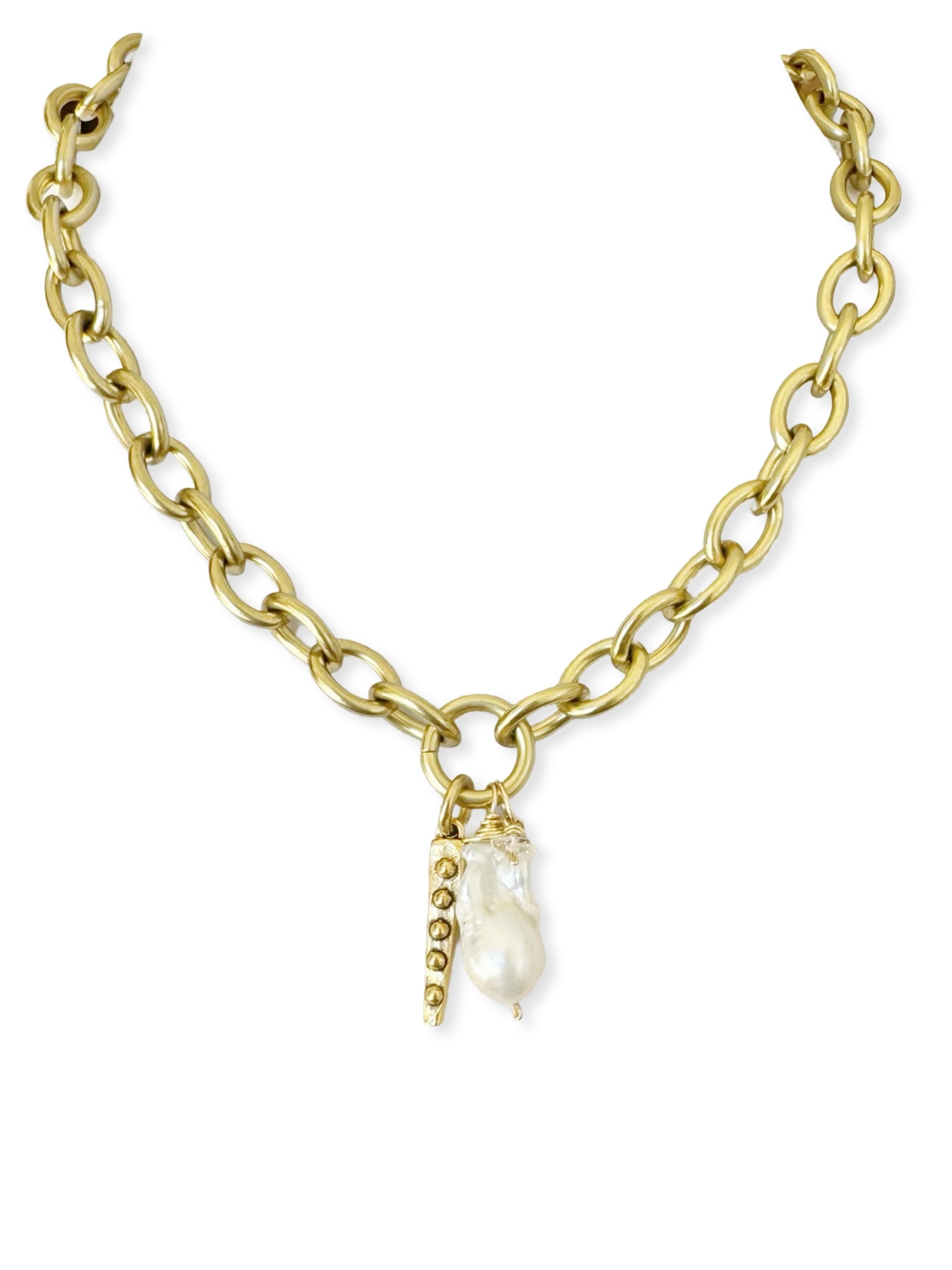 Chunky Brass Chain Necklace- Oval Chain w/ Pearl