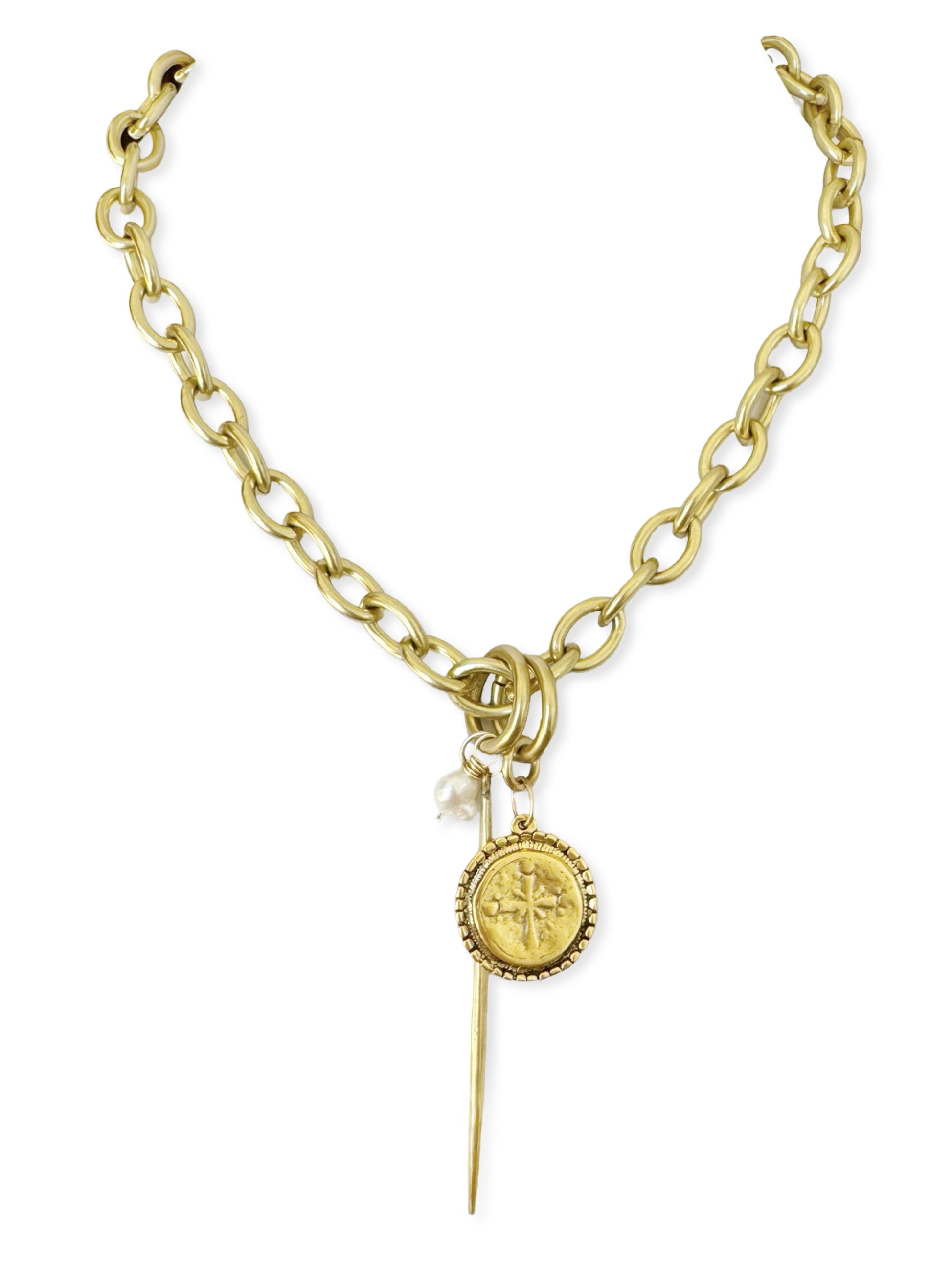 Chunky Brass Chain Necklace- Oval Chain w/ Quill & Dotted Ancient Coin