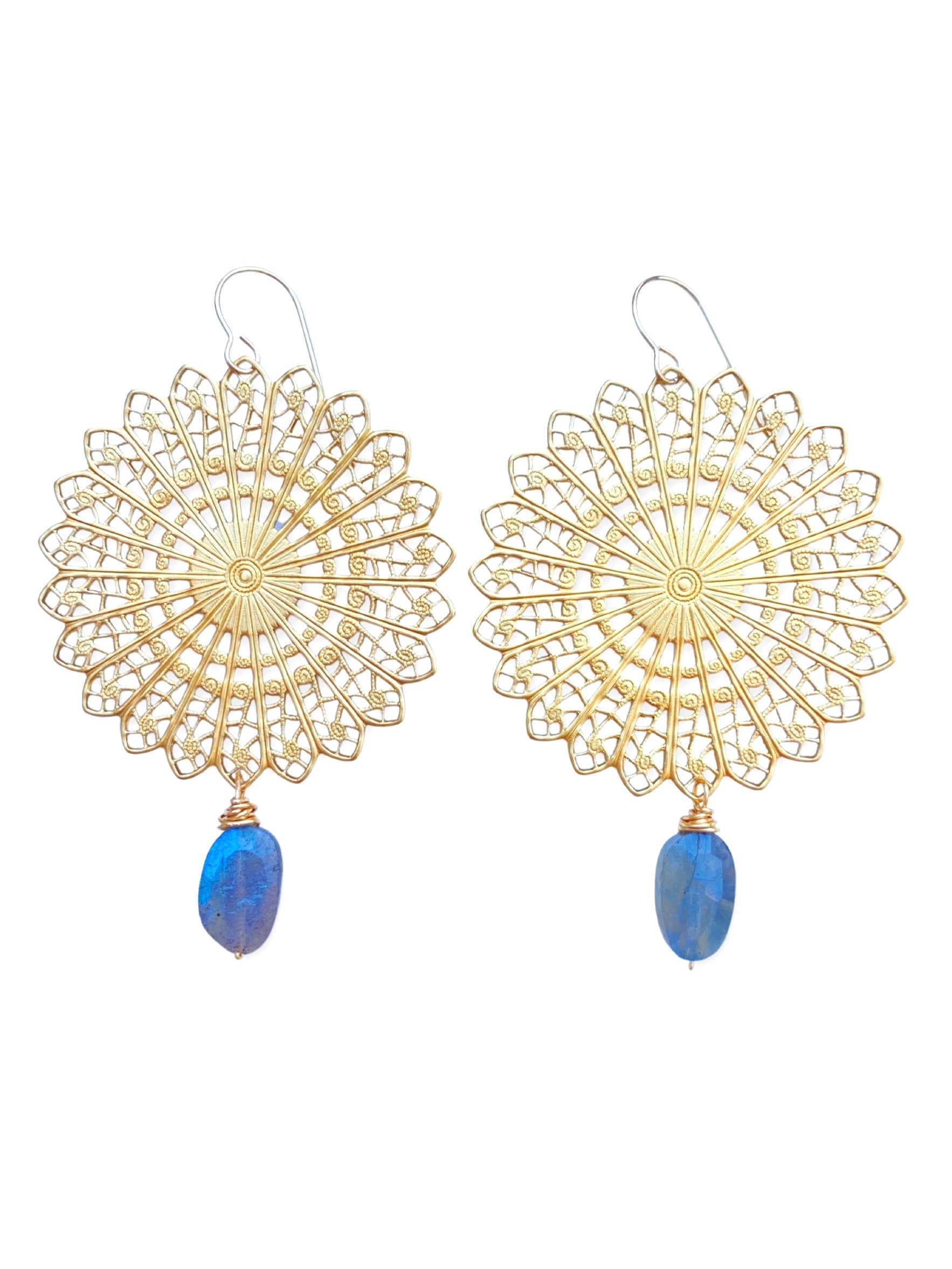 Labradorite hangs from gold disks making a statement earring that is so light weight that you can wear them all day and night.