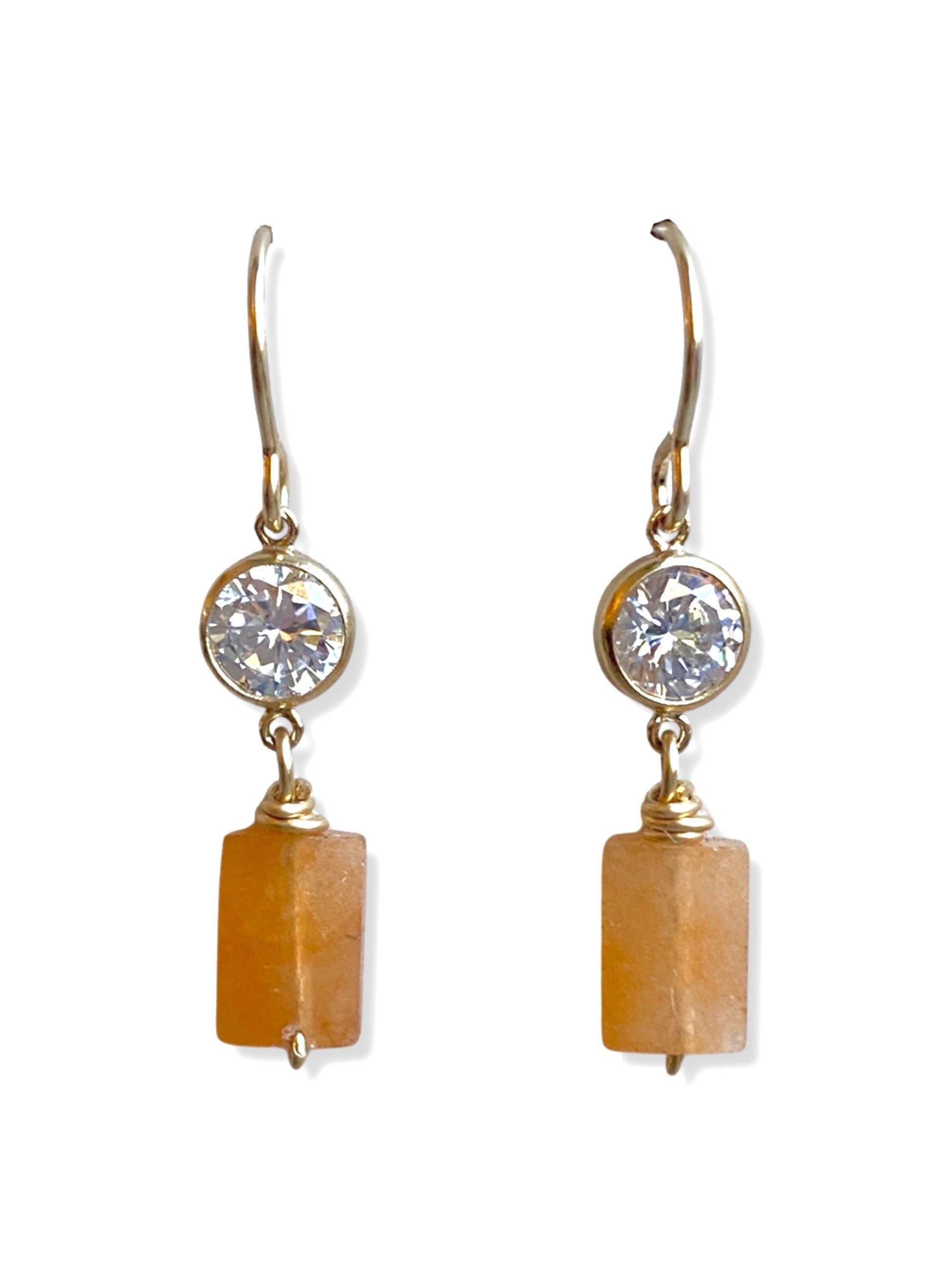 Orange tourmaline hangs from a sparkling Cubic Zirconia.