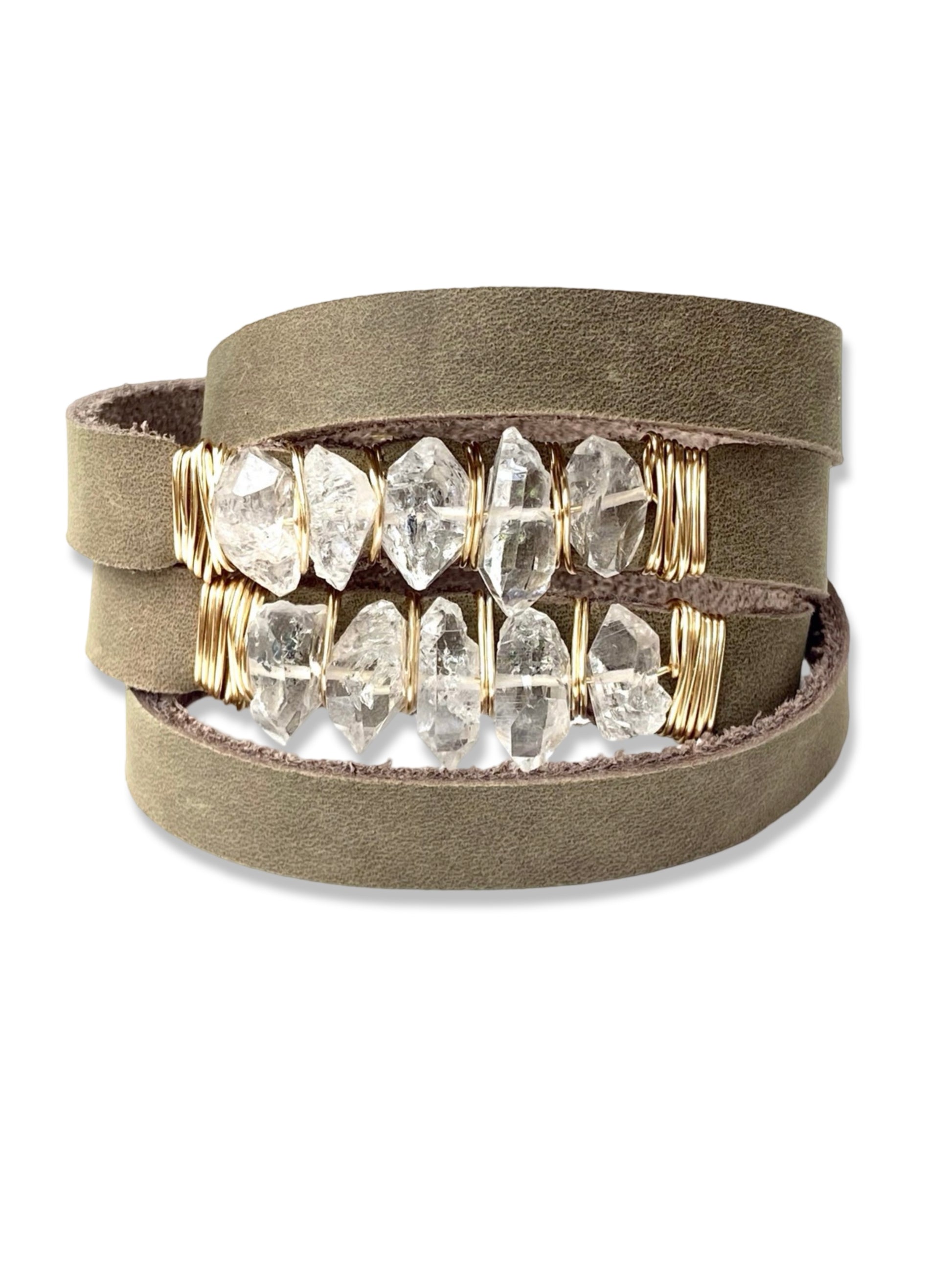 This double wrap looks more like a quadruple wrap, but much easier to put on. Oversized Herkimer Diamonds on army green leather.