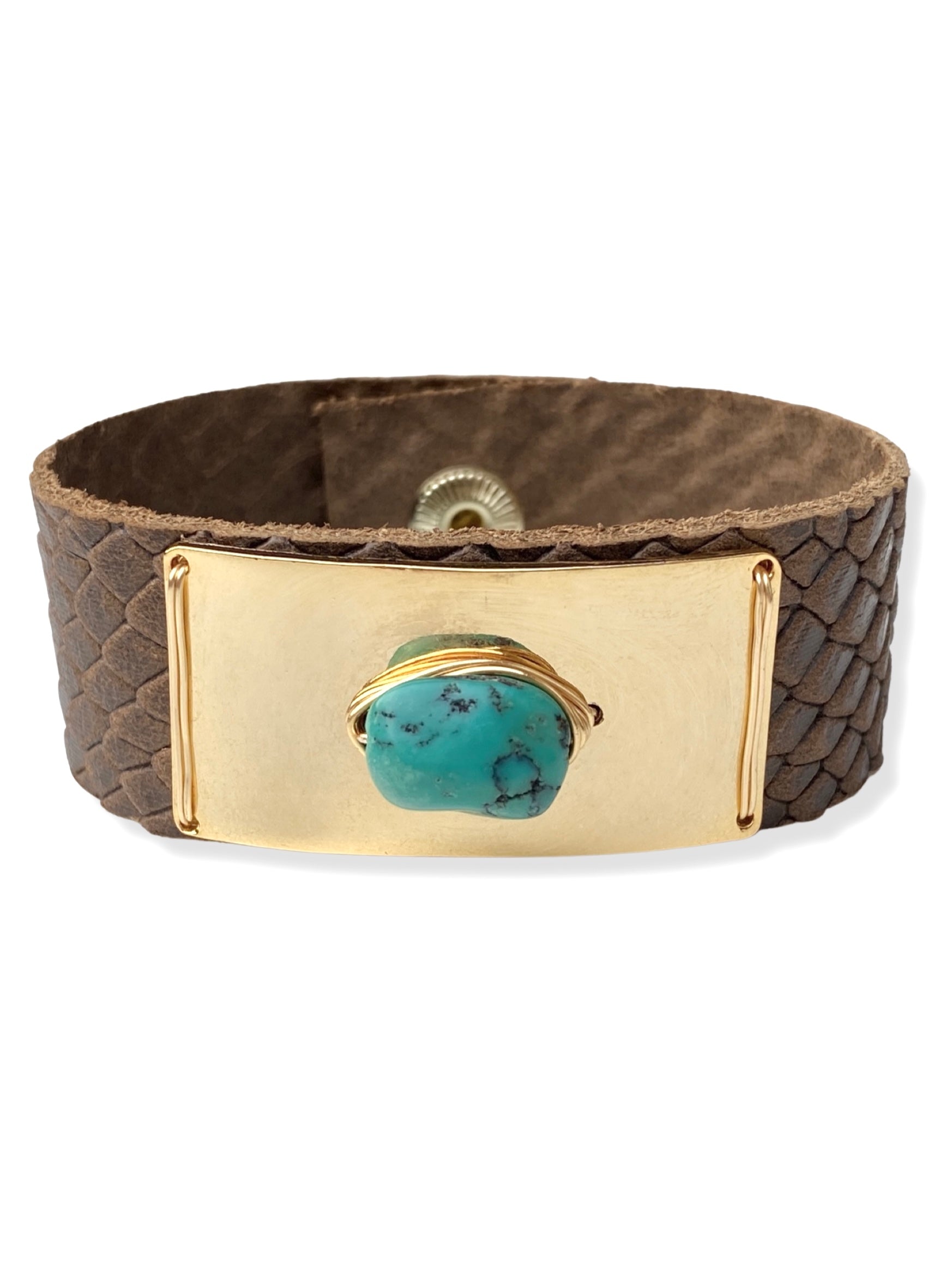 24K gold plated tag, wire wrapped onto snake skin embossed leather, with a turquoise detail.