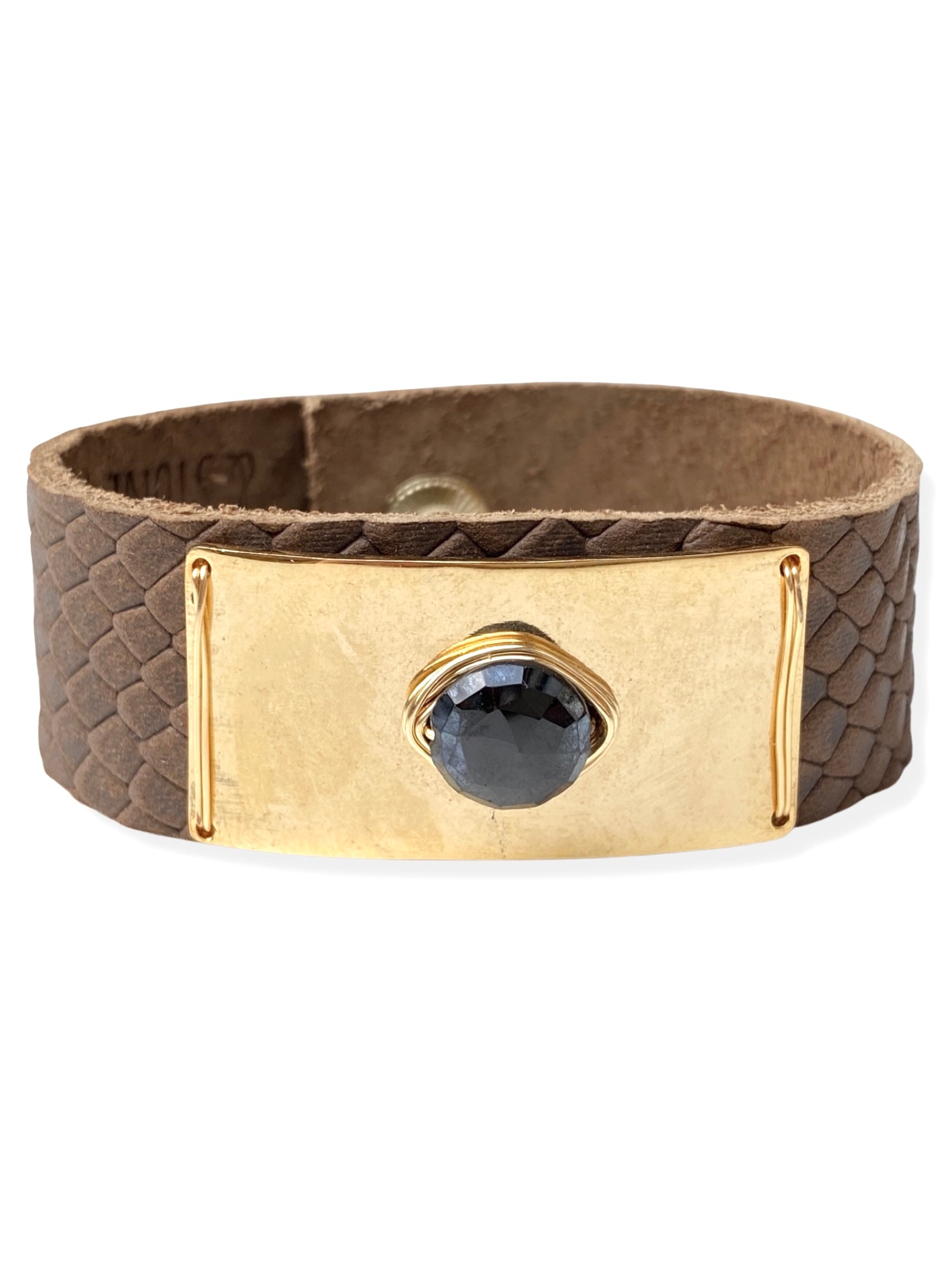 24K gold plated tag, wire wrapped onto snake skin embossed leather, with a onyx detail.