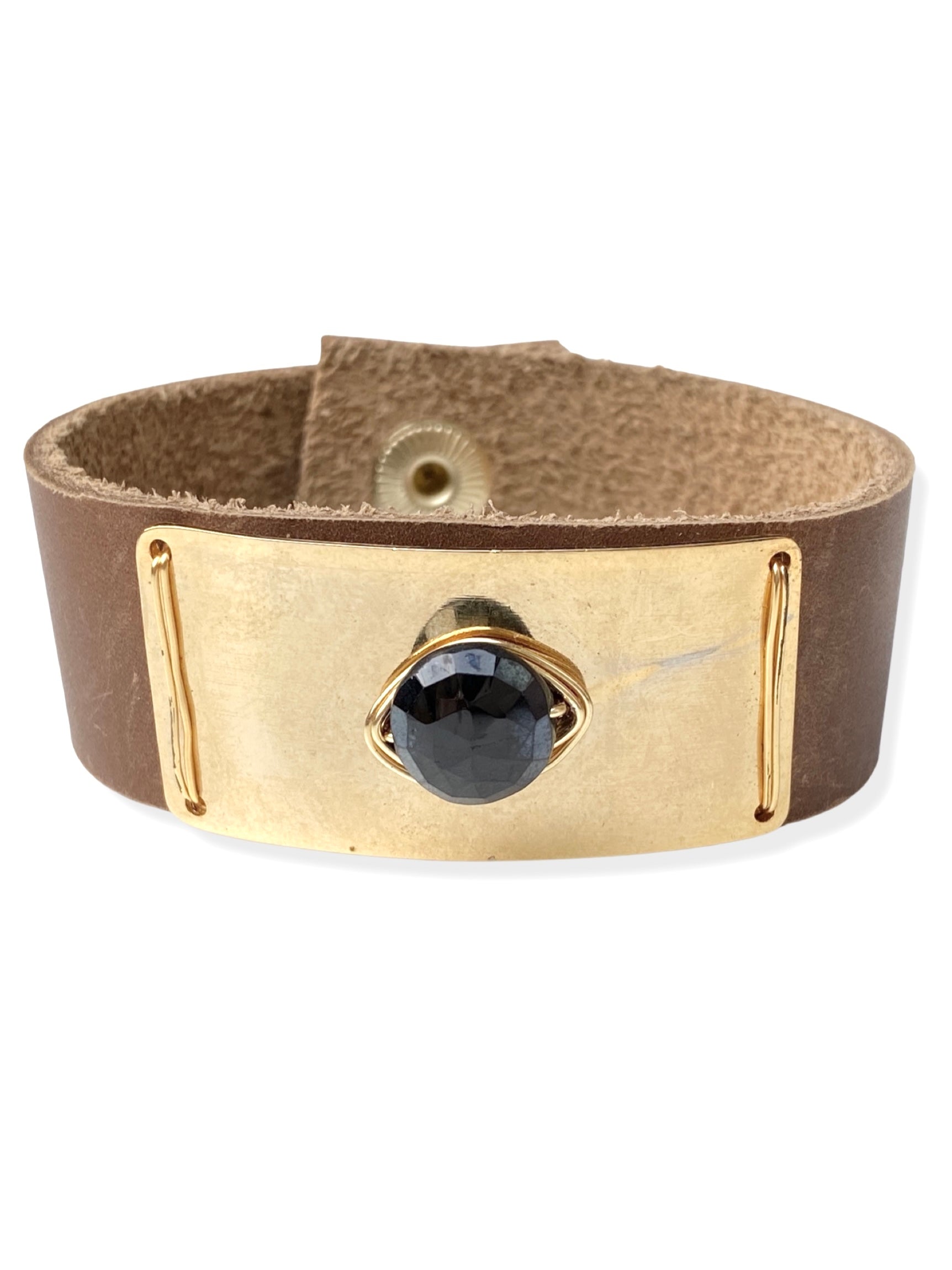 24K gold plated tag, wire wrapped onto caramel brown leather, with a onyx detail.