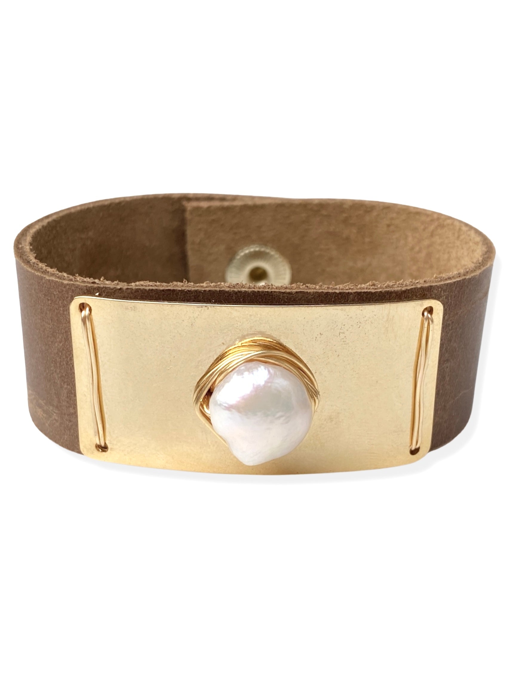Gold Plate Snap- Caramel Leather & Pearl