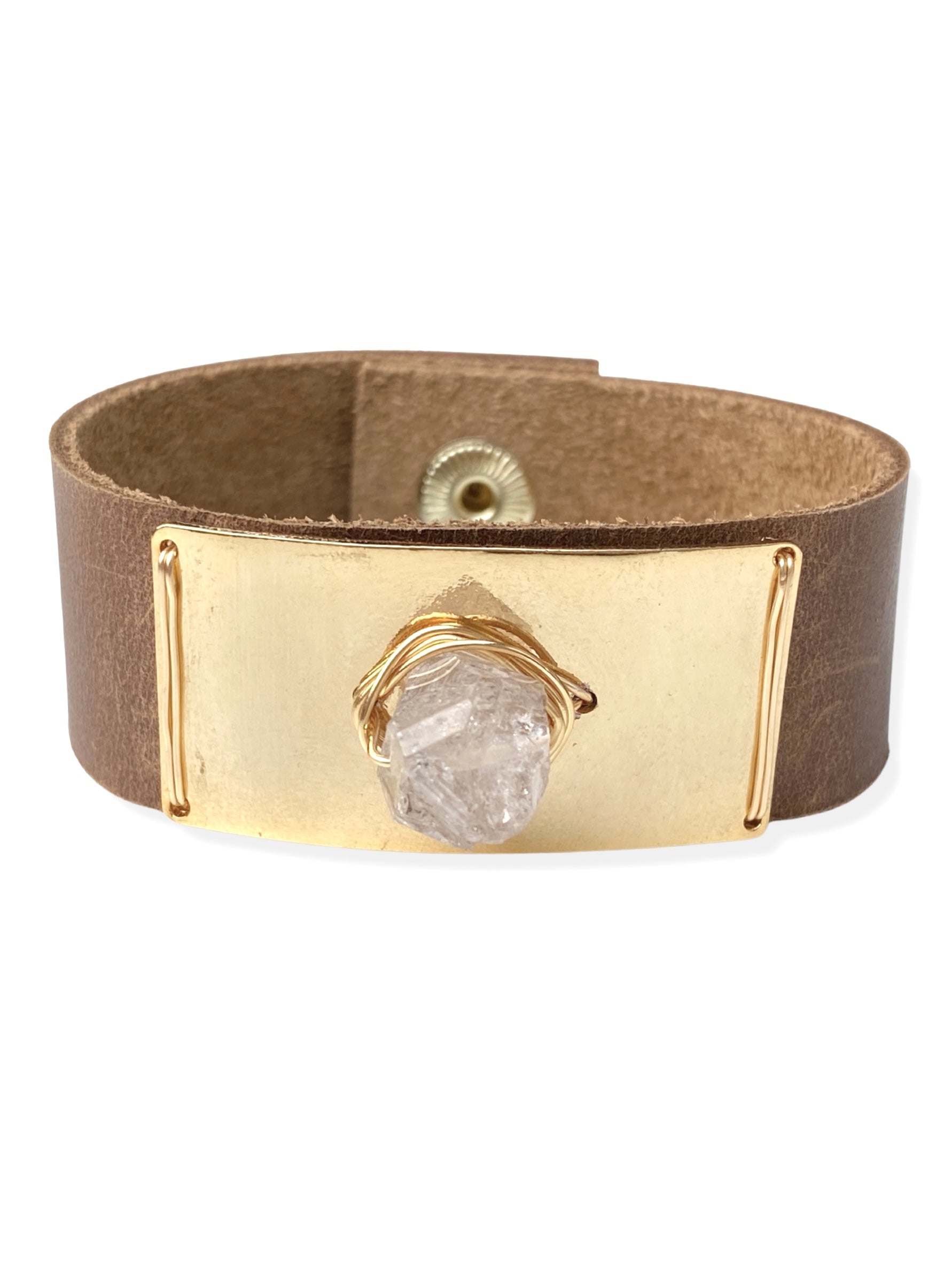 Gold Plate Snap- Caramel Leather & Herkimer Diamond