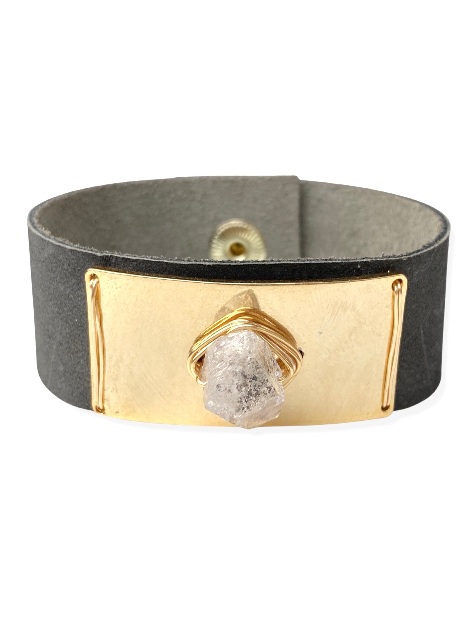 Gold Plate Snap- Charcoal Leather & Herkimer Diamond
