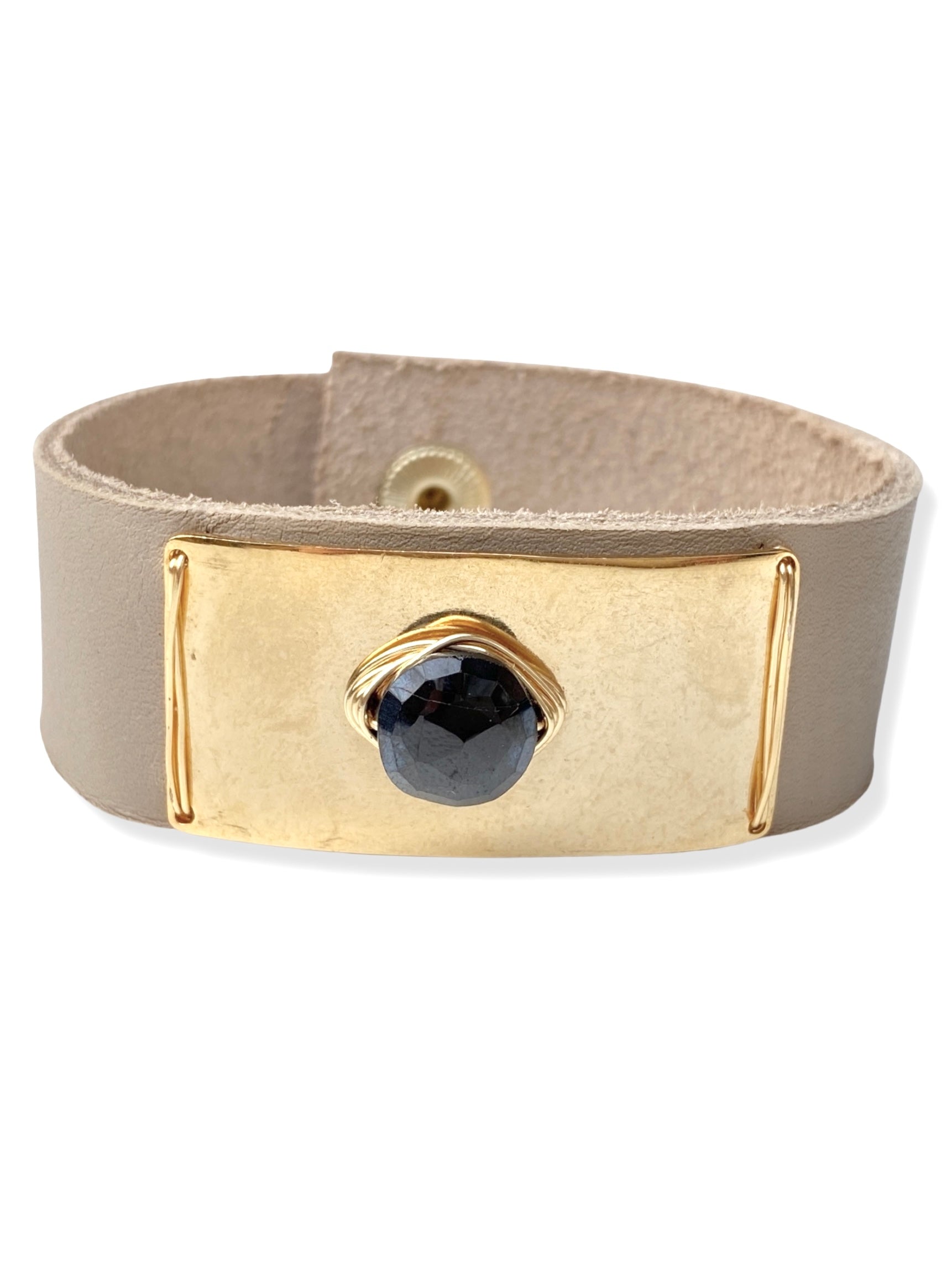 24K gold plated tag, wire wrapped onto taupe leather, with an onyx detail.