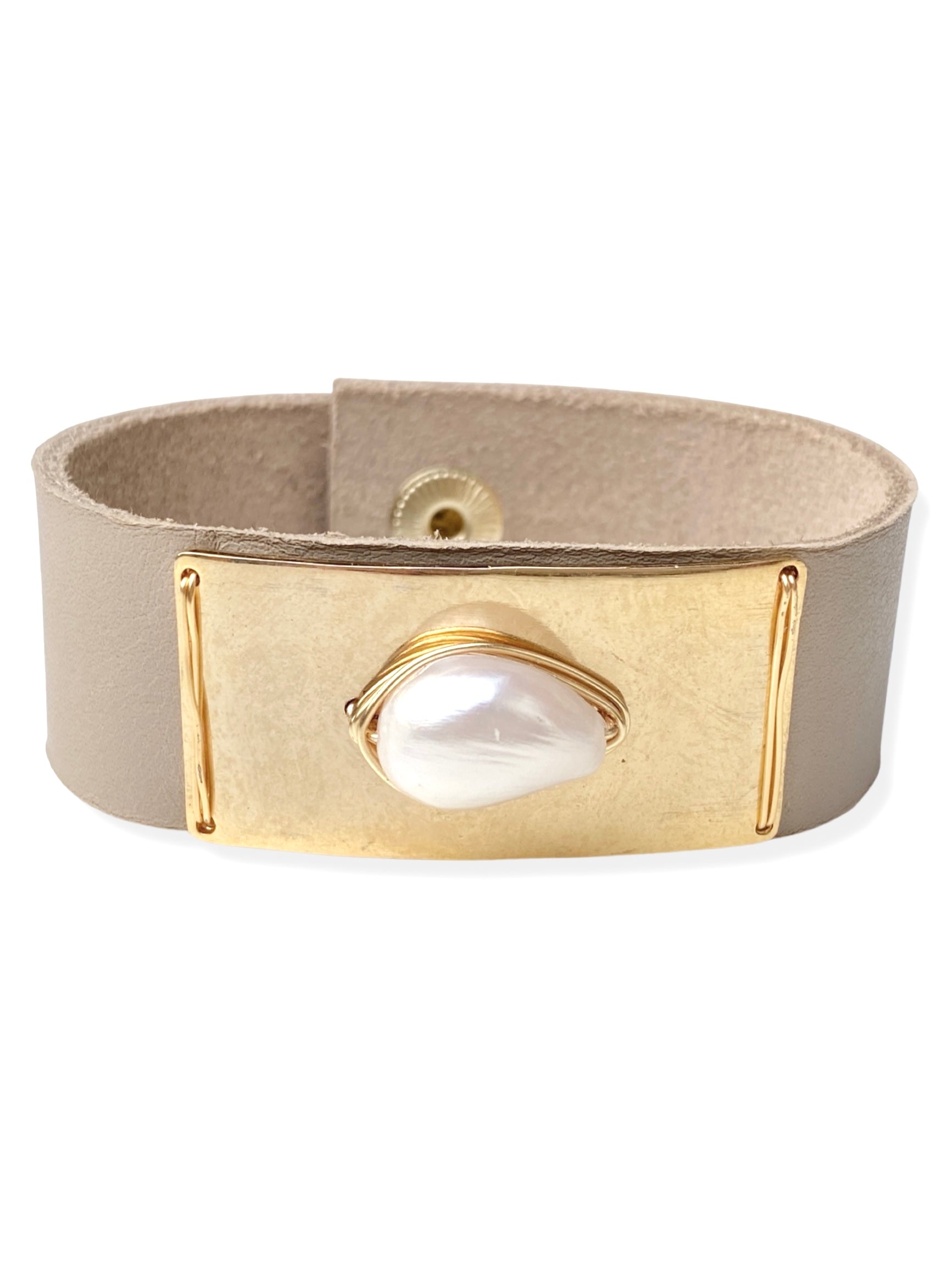 24K gold plated tag, wire wrapped onto taupe leather, with a pearl detail.