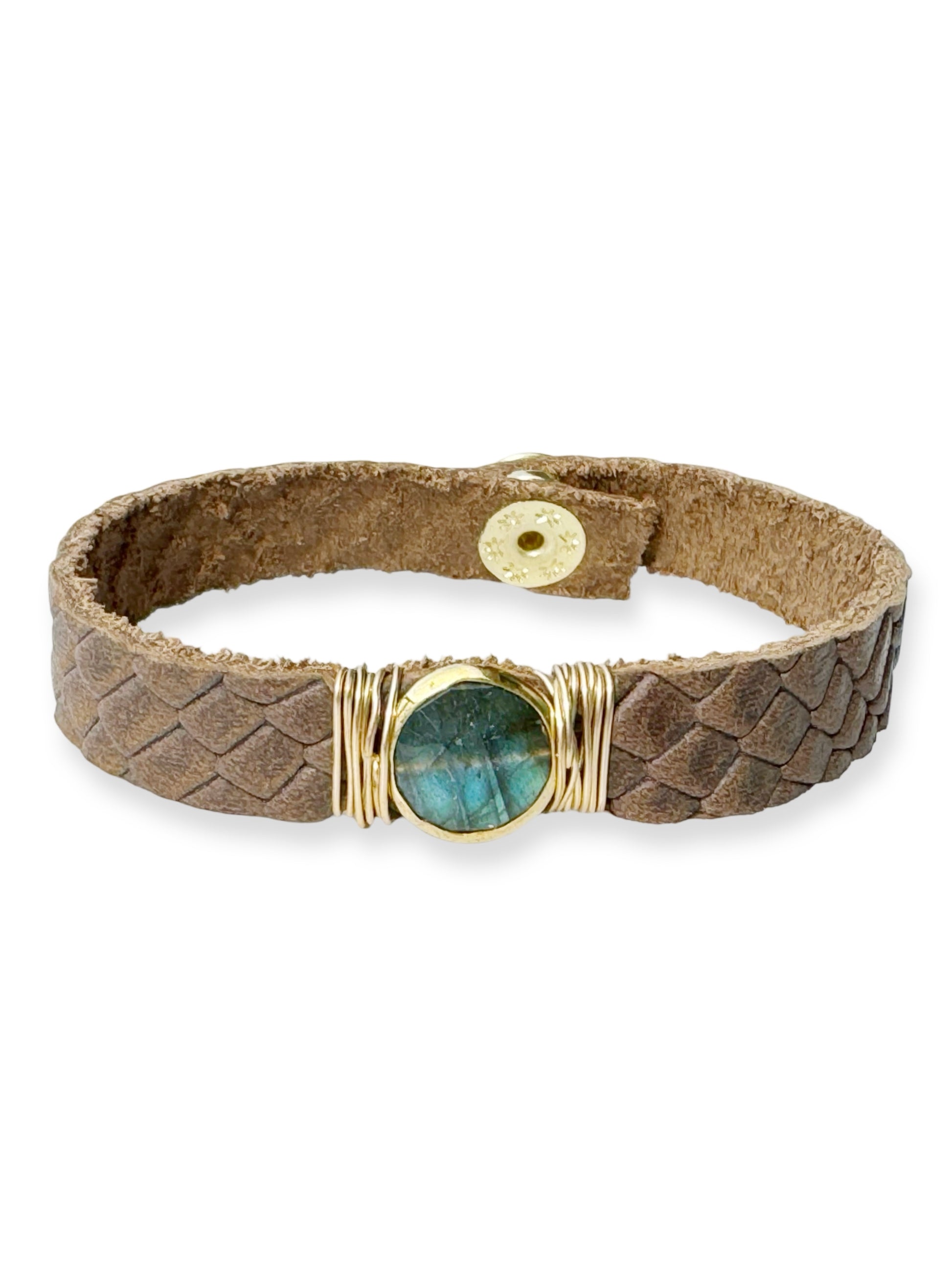 This handcrafted bracelet features a single labradorite stone set in gold vermeil, wire wrapped onto a soft leather band and finished with an easy snap closure for comfortable everyday wear.