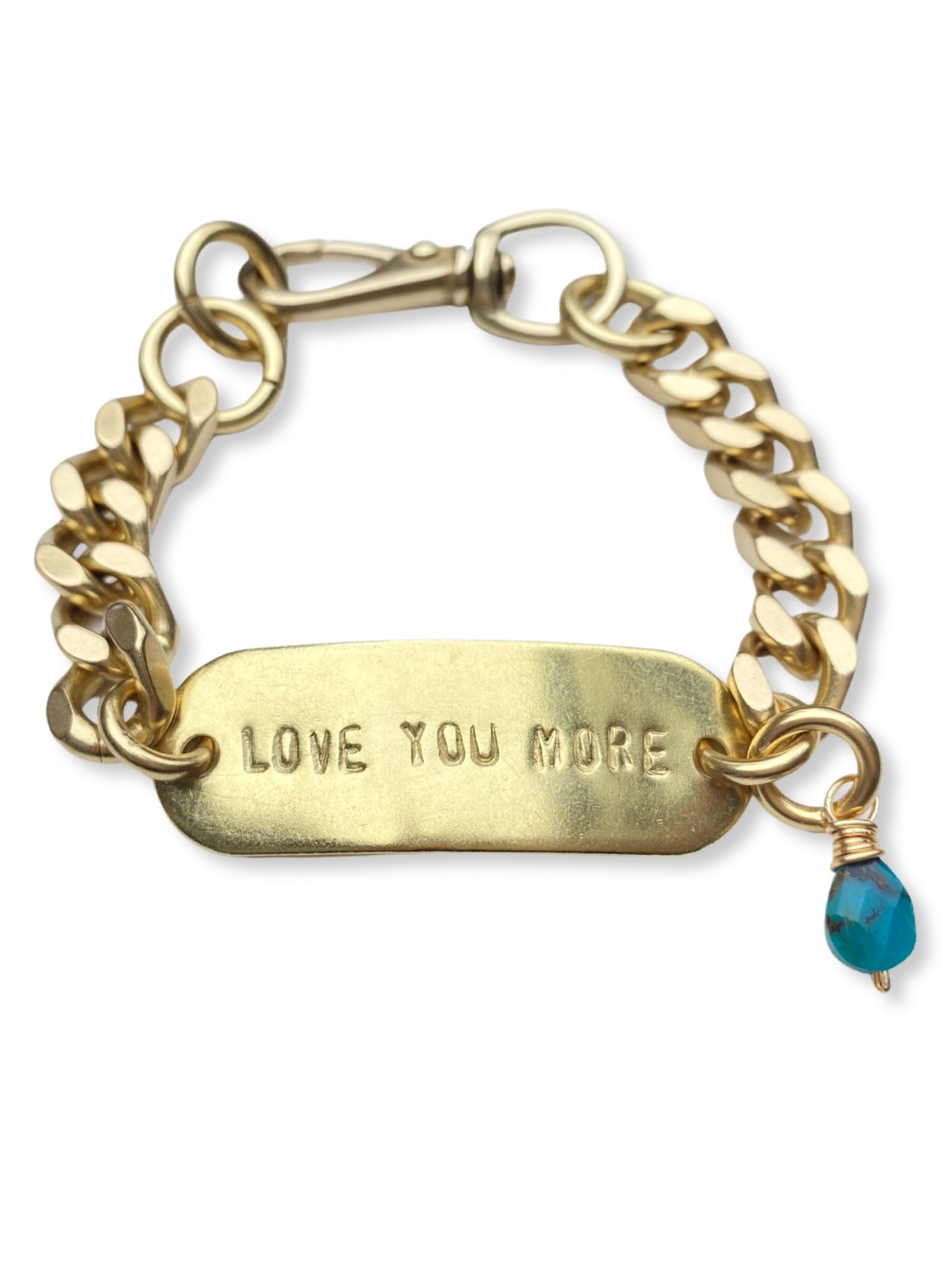 These solid brass chain bracelets have been a # 1 seller. The chain is tarnish resistant, and the nameplate is raw brass, so will require polishing occasionally.