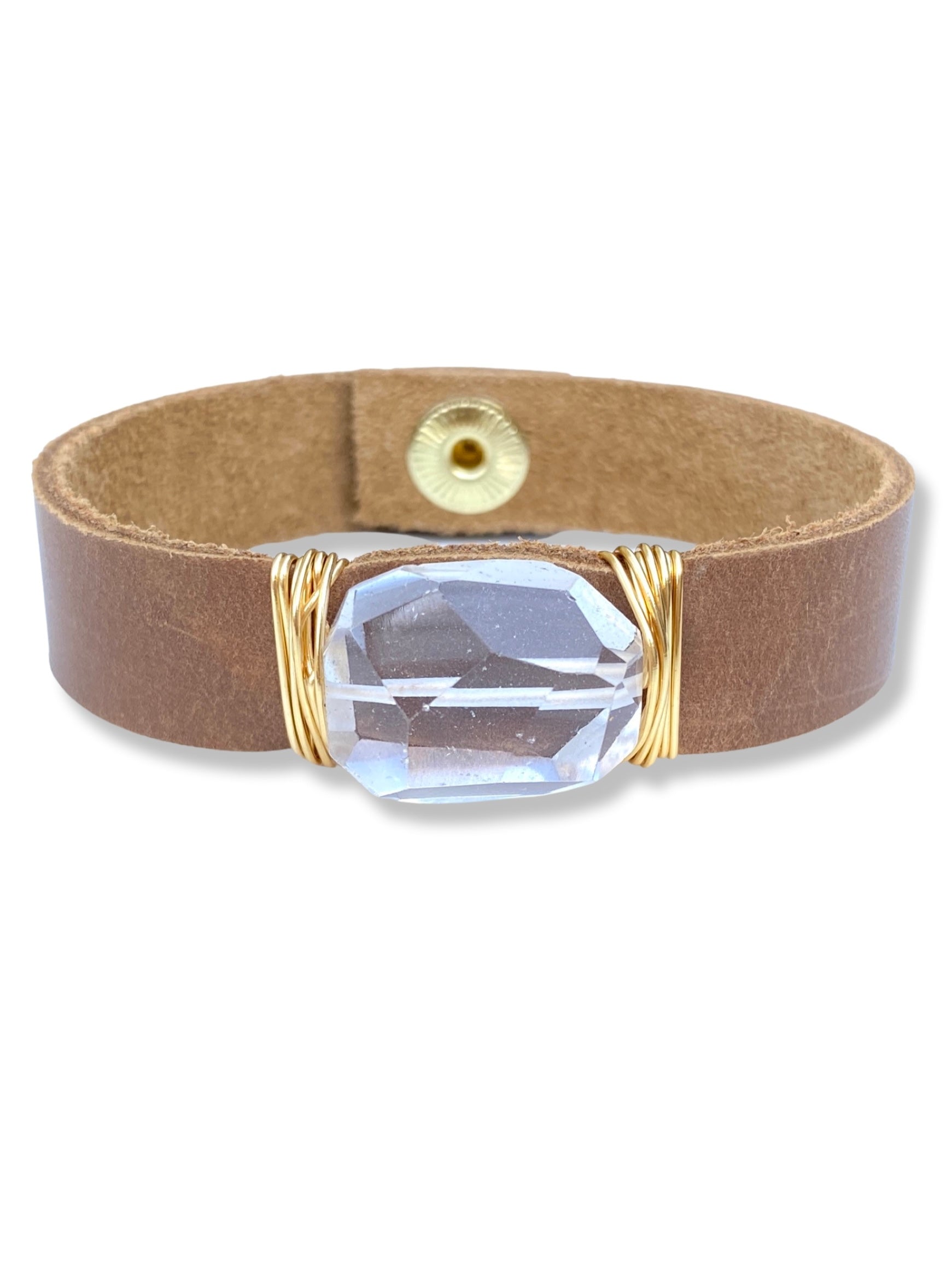 Quartz wrapped onto caramel brown leather with a snap fastener.