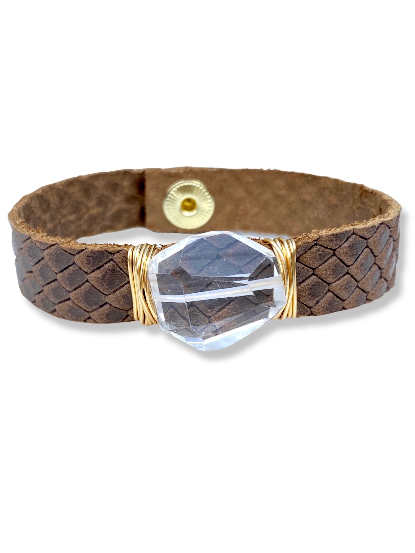 Quartz wrapped onto snake skin embossed leather with a snap fastener.