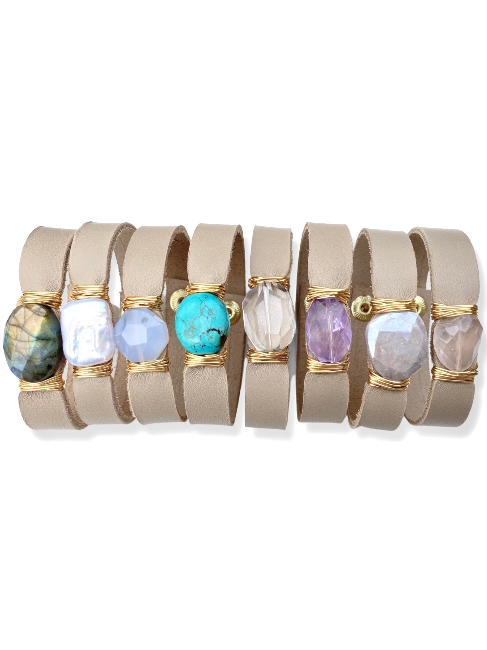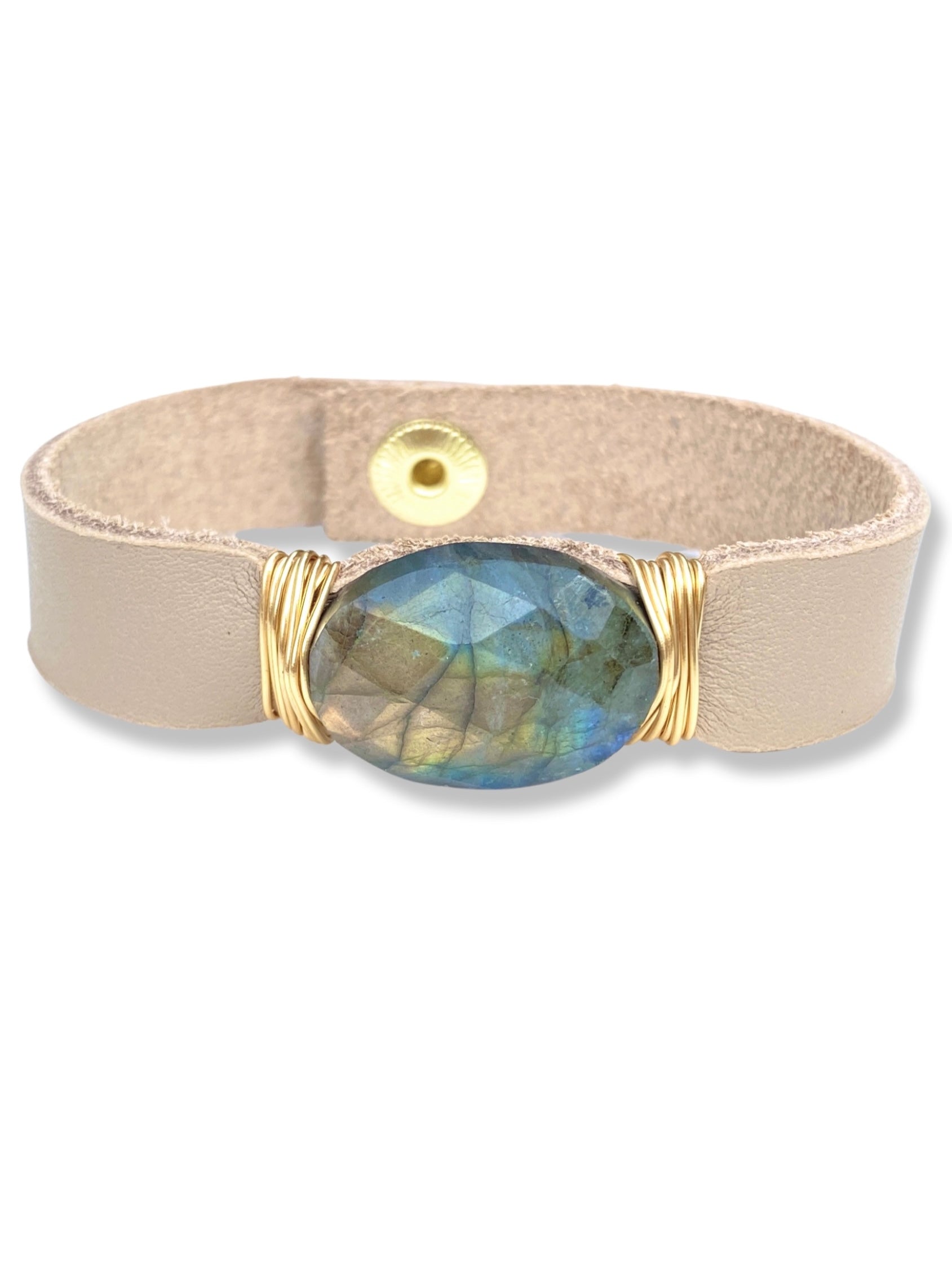 Labradorite wrapped onto Taupe leather with a snap fastener.