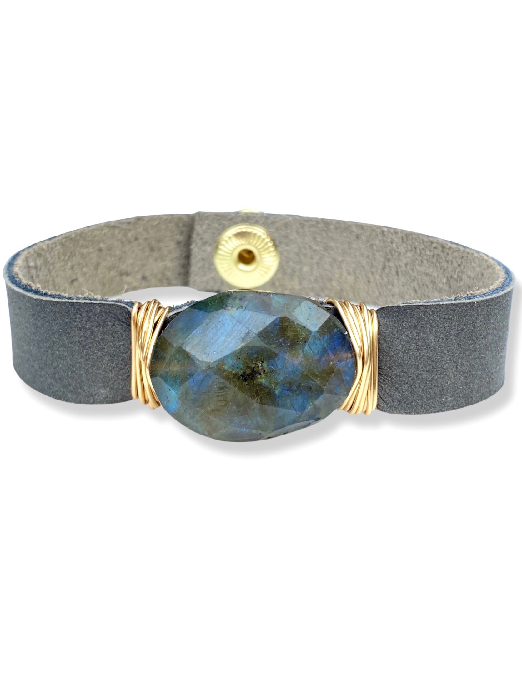 Labradorite wrapped onto rich charcoal leather with a snap fastener.