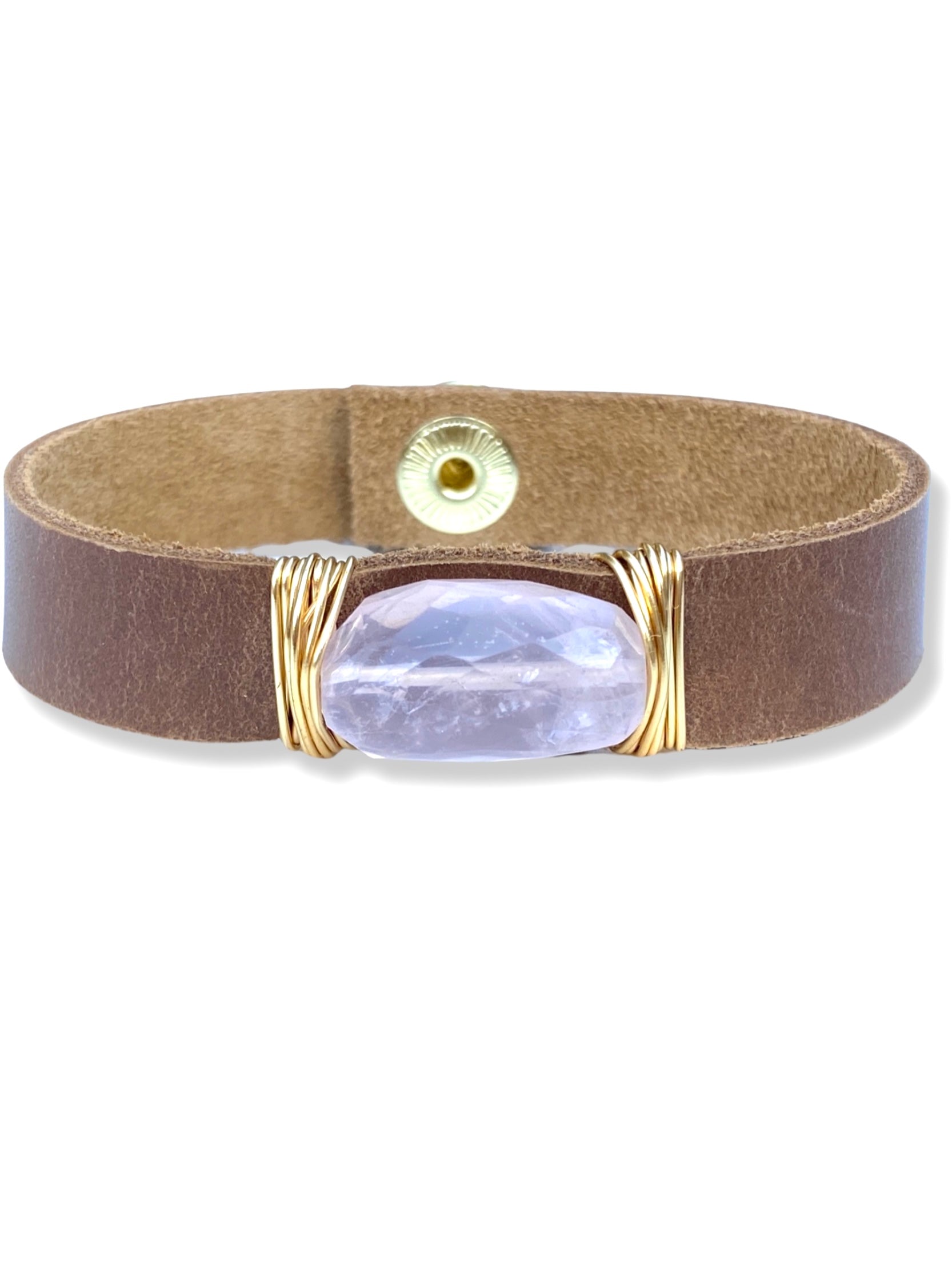 Rose Quartz wrapped onto caramel brown leather with a snap fastener.