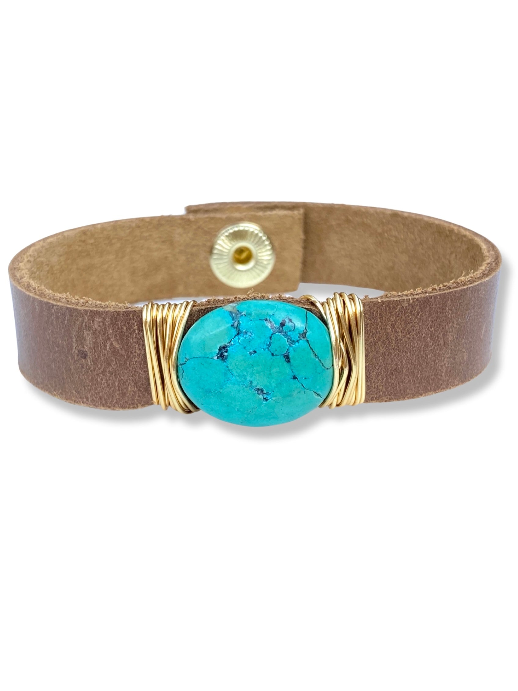 Turquoise wrapped onto caramel brown leather with a snap fastener.