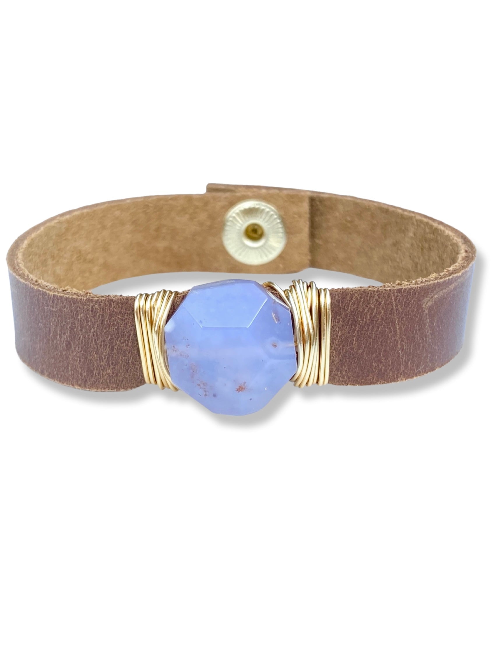 Blue lace agate wrapped onto caramel brown leather with a snap fastener.
