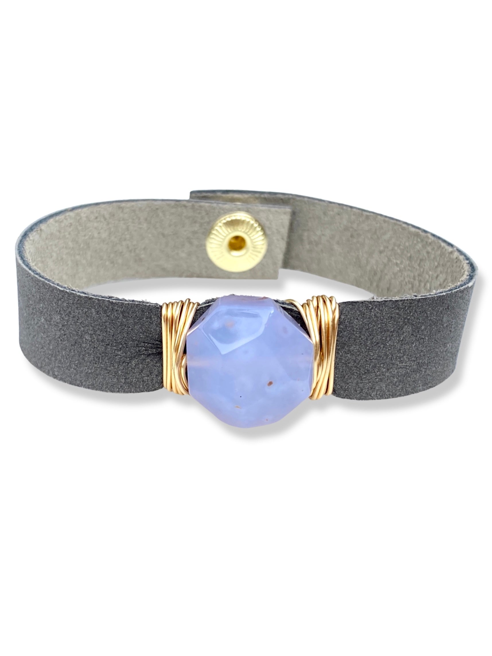 Blue lace agate wrapped onto rich charcoal leather with a snap fastener.
