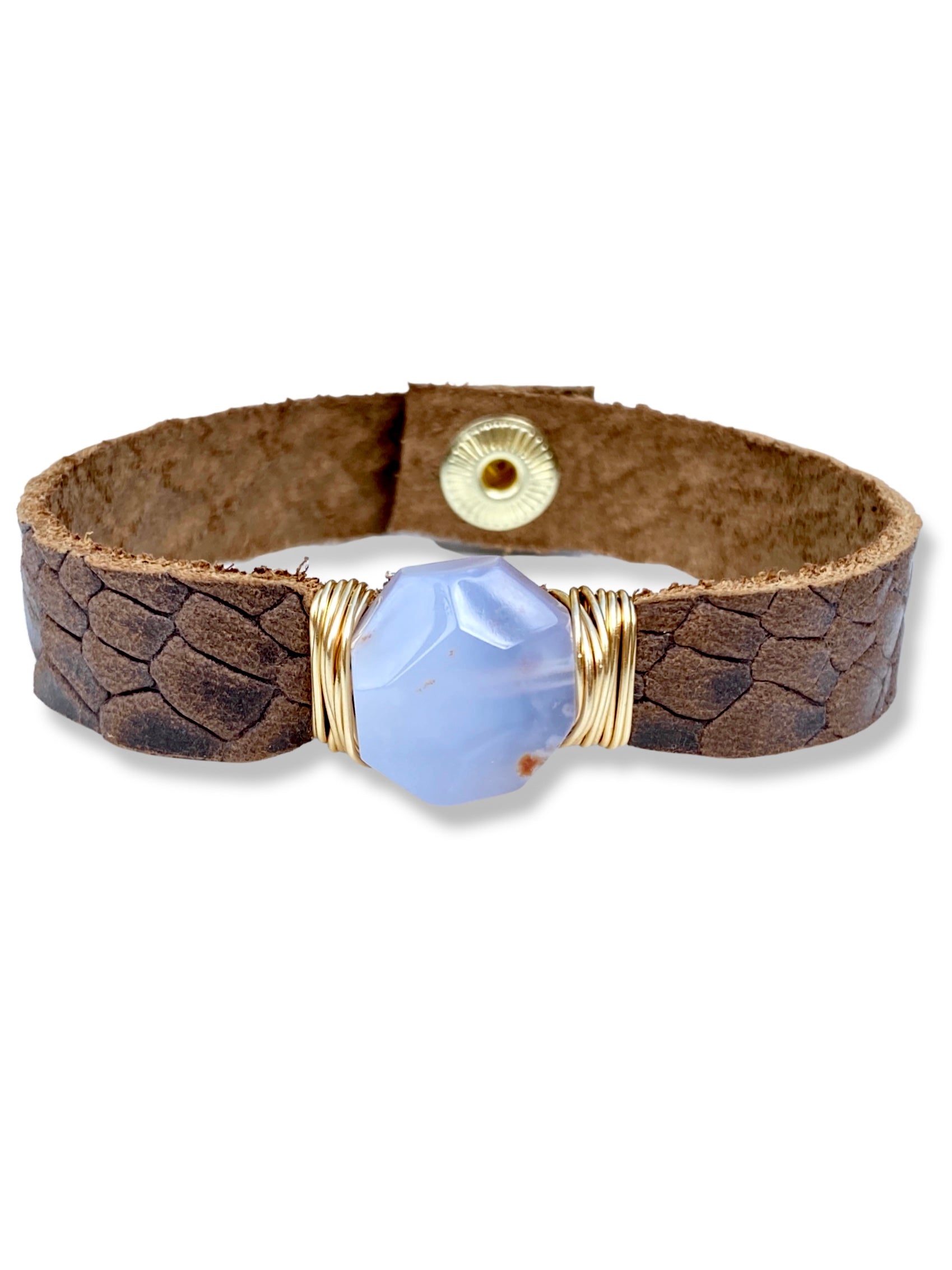Blue lace agate wrapped onto snake skin embossed leather with a snap fastener.