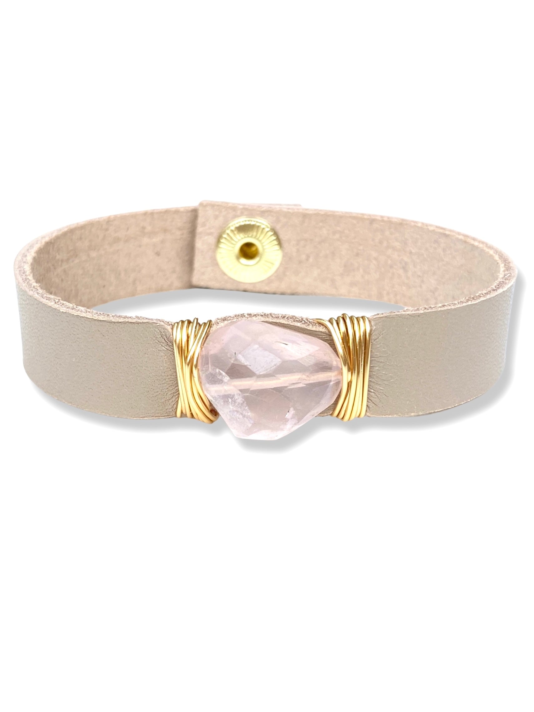 Rose quartz wrapped onto Taupe leather with a snap fastener.