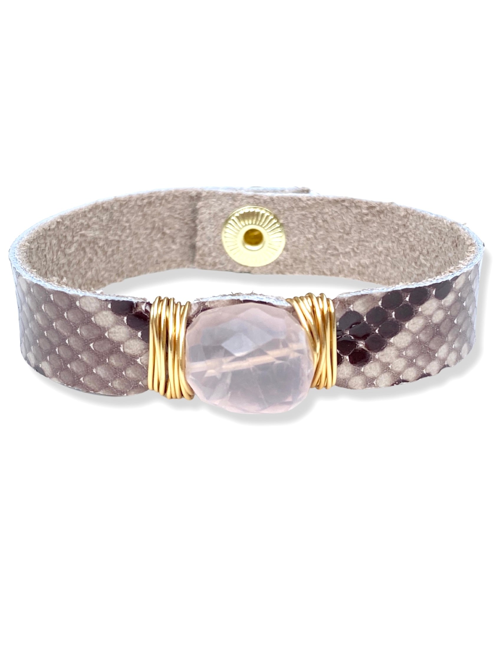 Rose quartz wrapped onto faux python leather with a snap fastener.