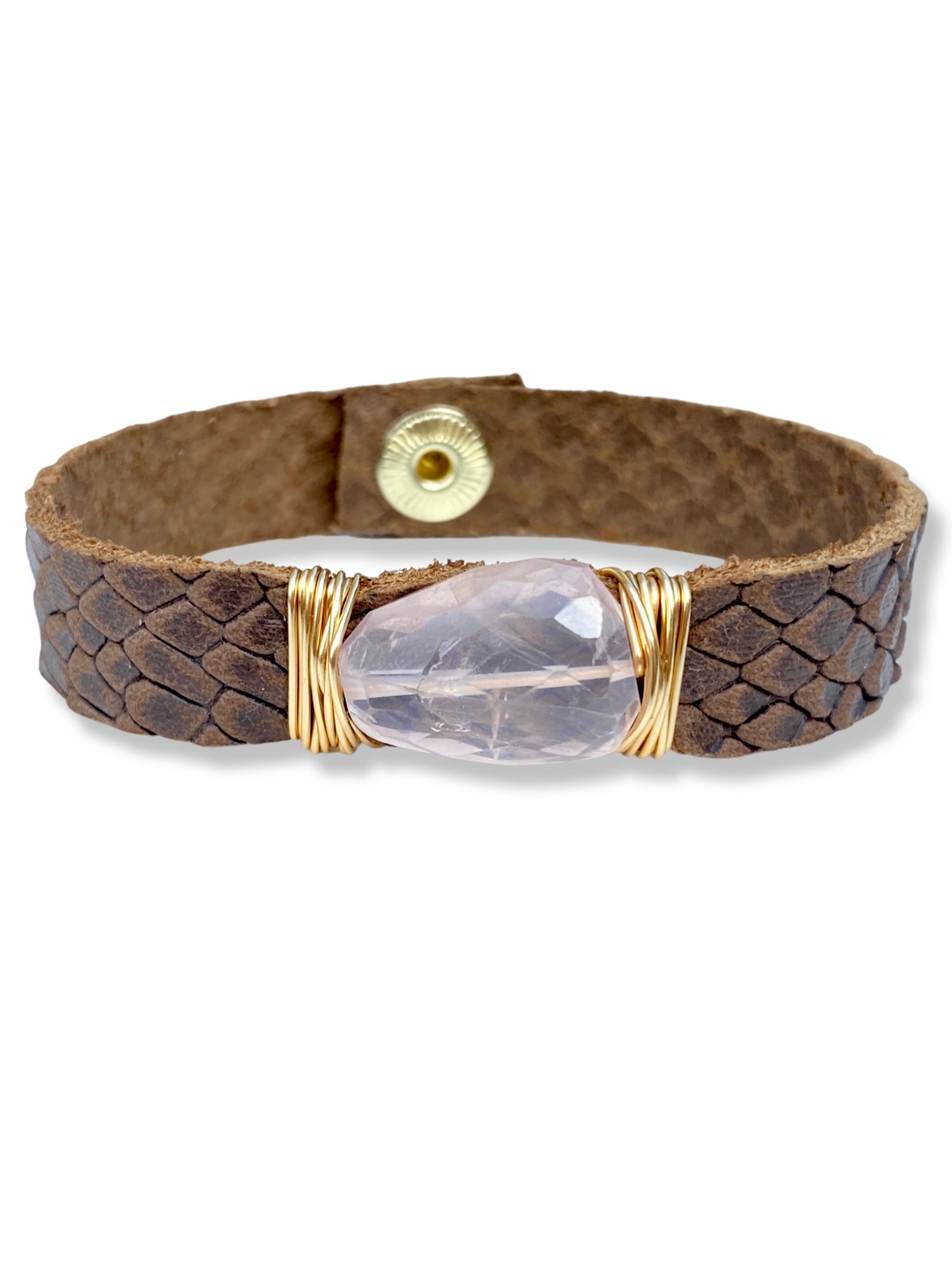 Rose quartz wrapped onto snake skin embossed leather with a snap fastener.