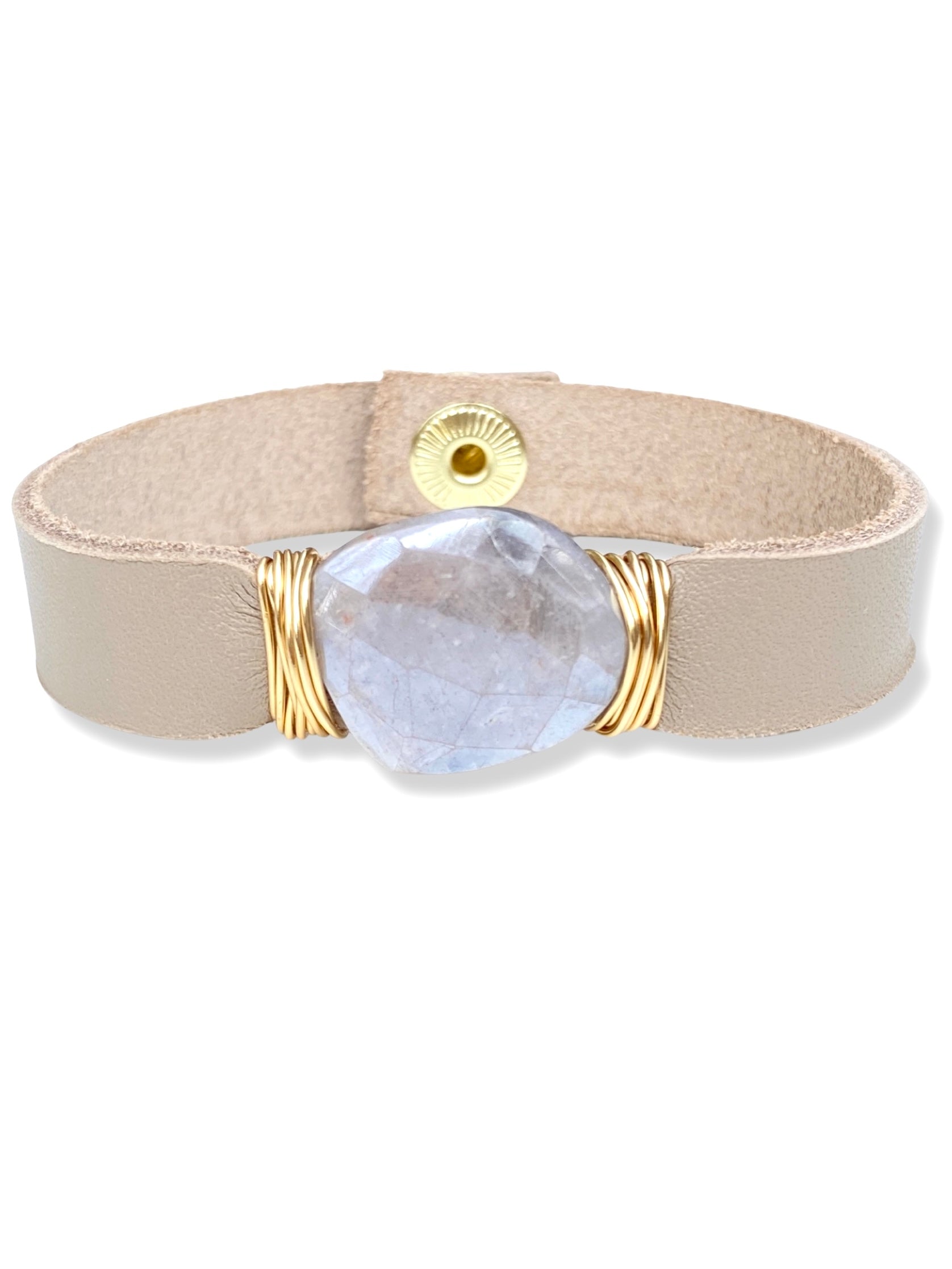 Moonstone wrapped onto Taupe leather with a snap fastener.