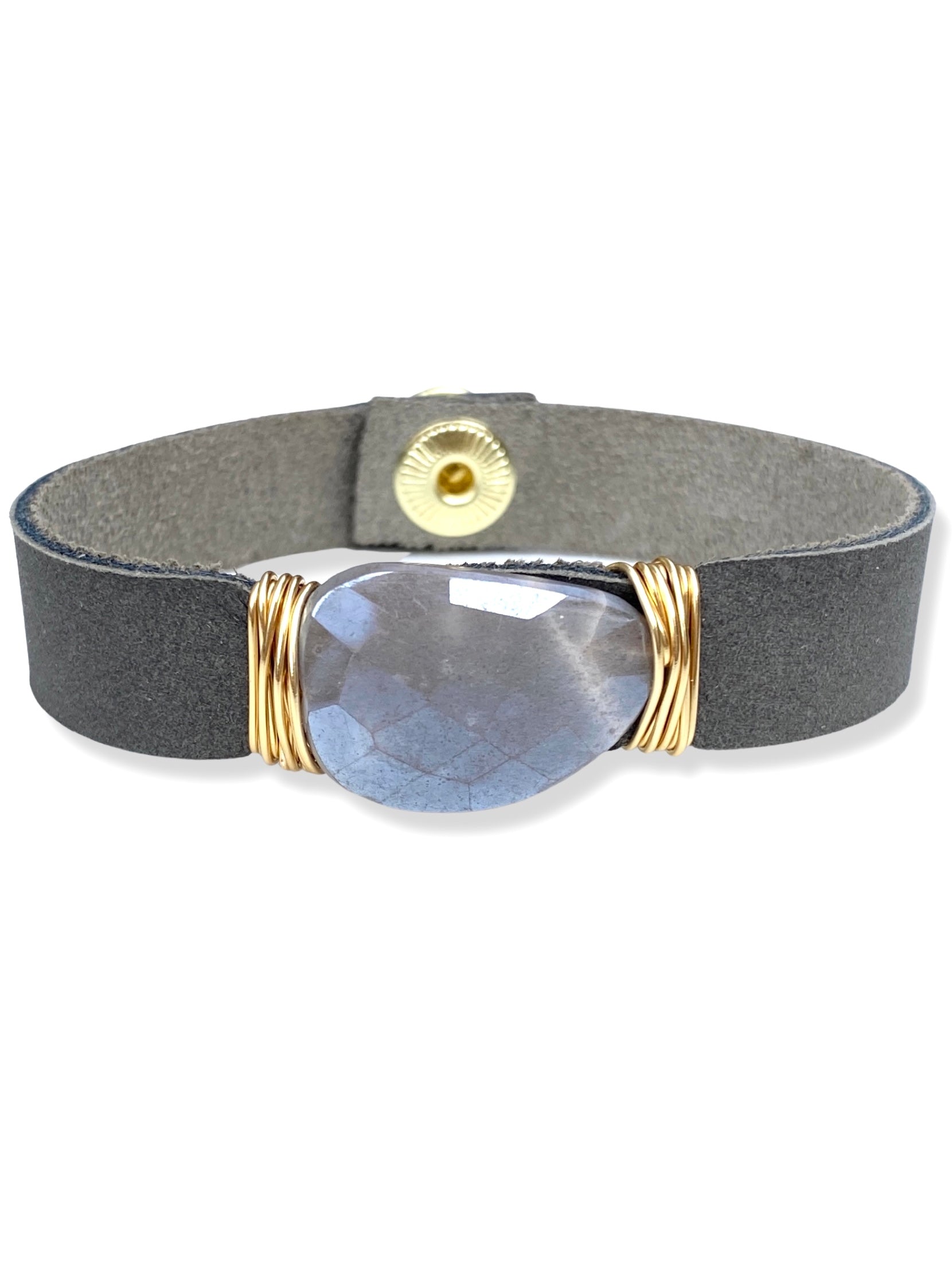 Moonstone wrapped onto rich charcoal leather with a snap fastener.