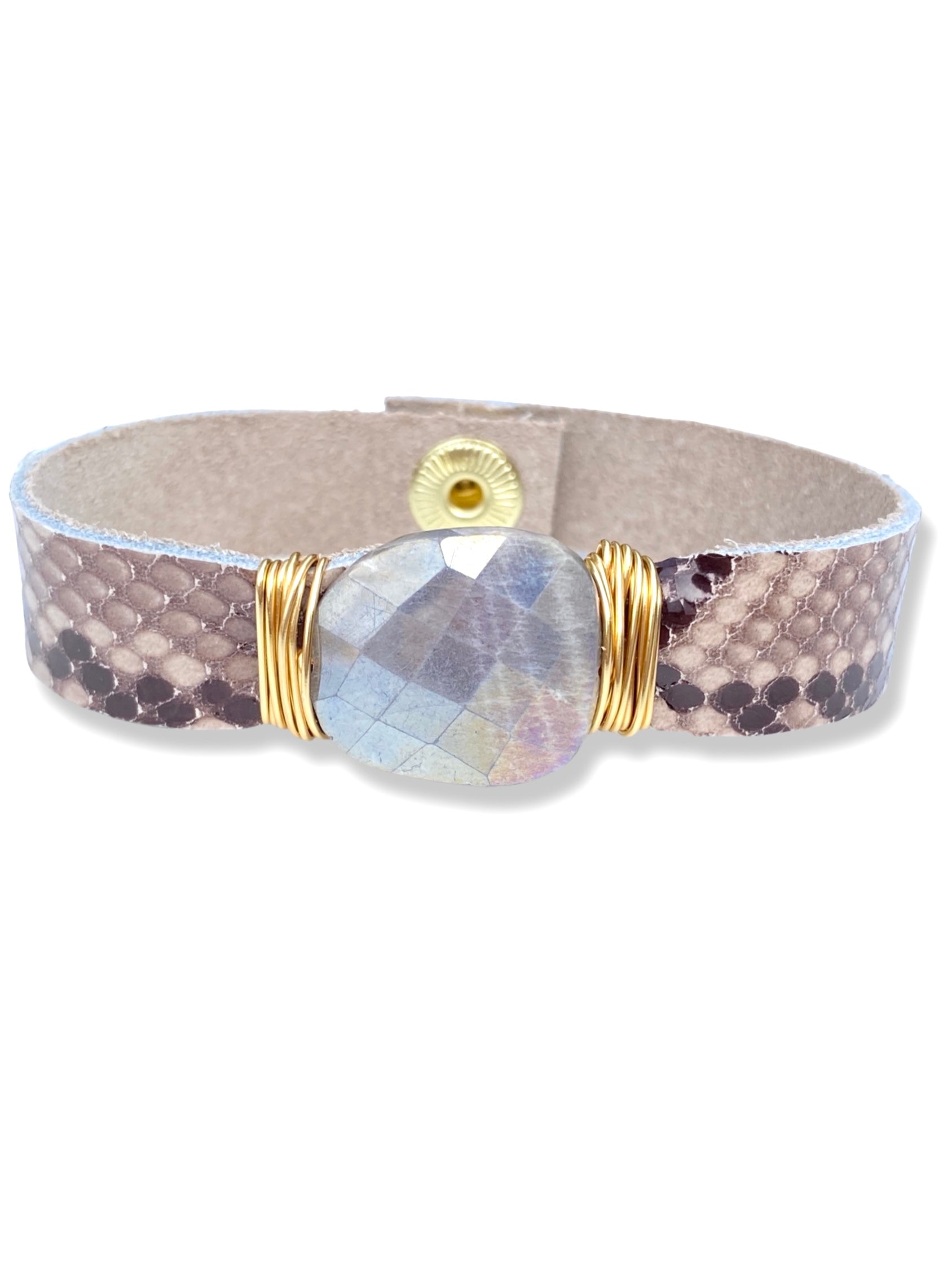 Moonstone wrapped onto faux python leather with a snap fastener.