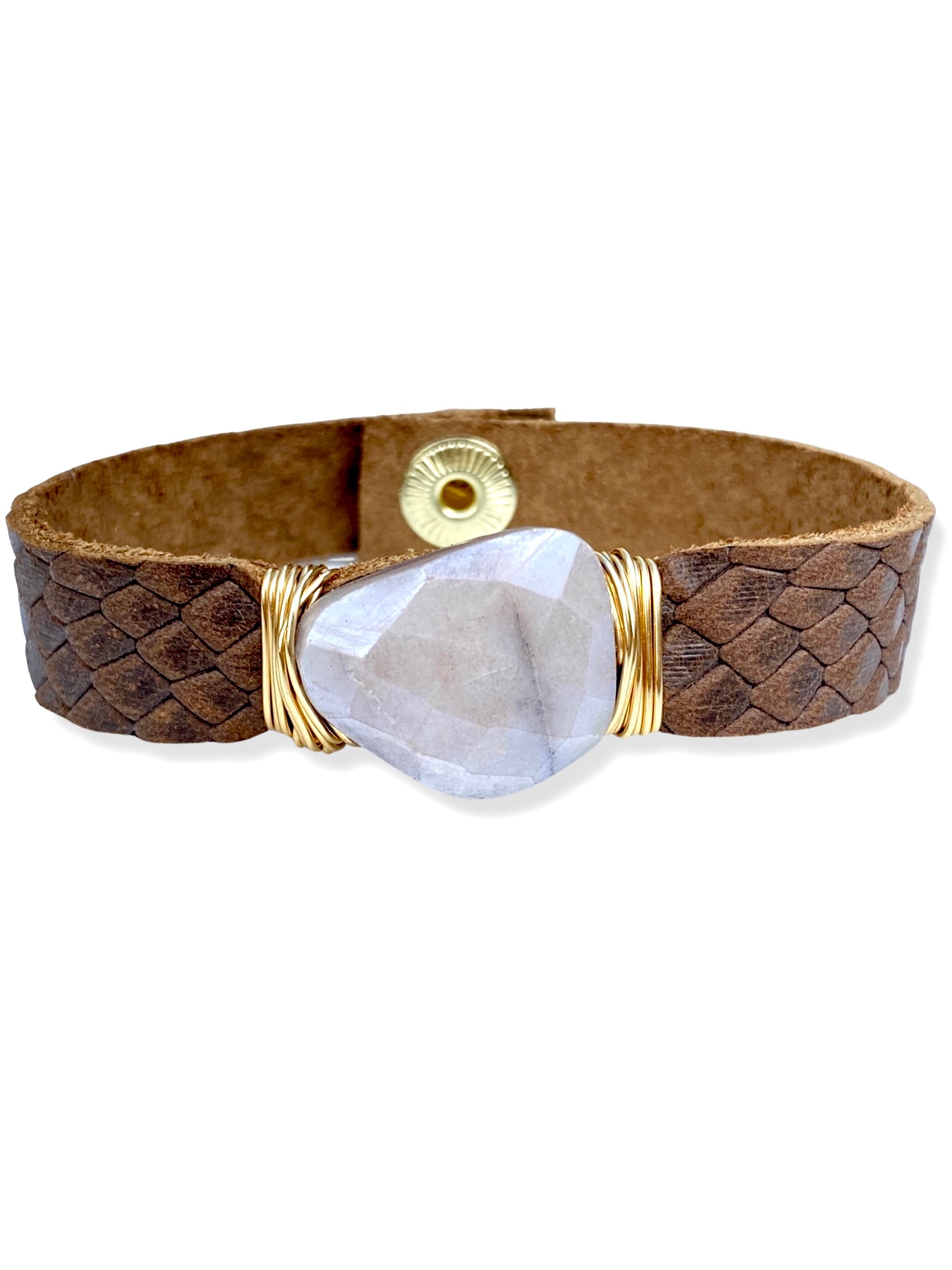 Moonstone wrapped onto snake skin embossed leather with a snap fastener.
