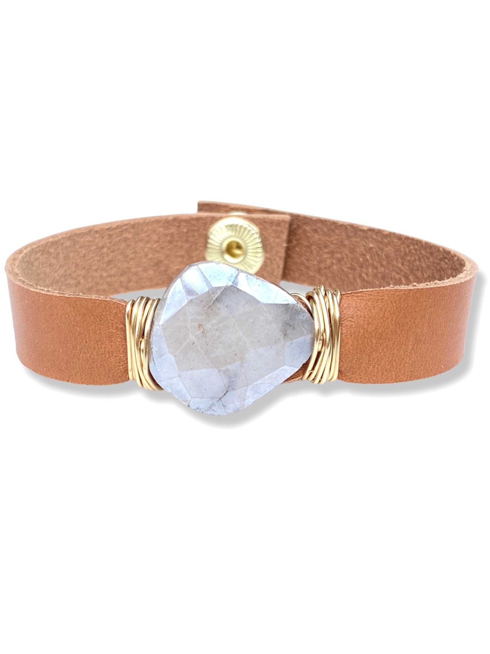 Moonstone wrapped onto saddle tan leather with a snap fastener.