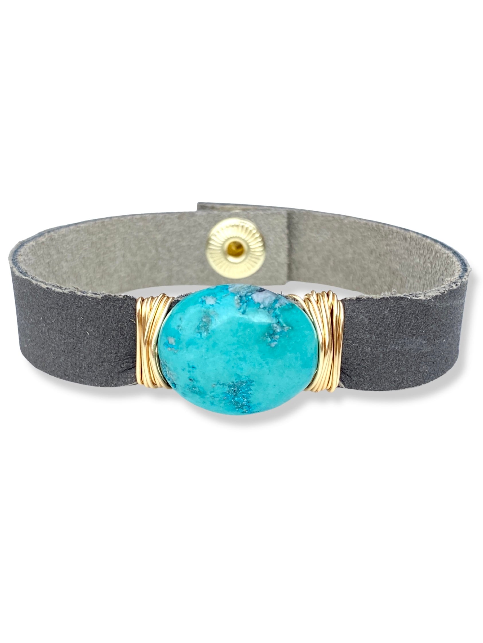 Turquoise wrapped onto rich charcoal leather with a snap fastener.