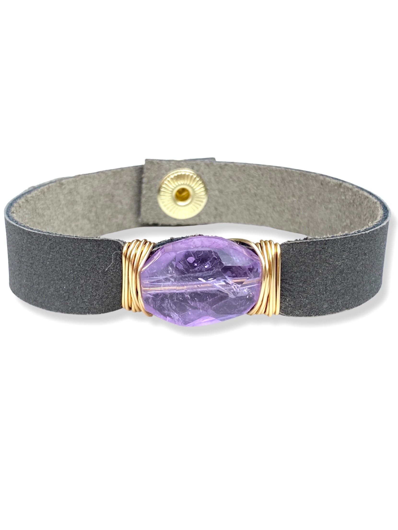 Amethyst wrapped onto rich charcoal leather with a snap fastener.