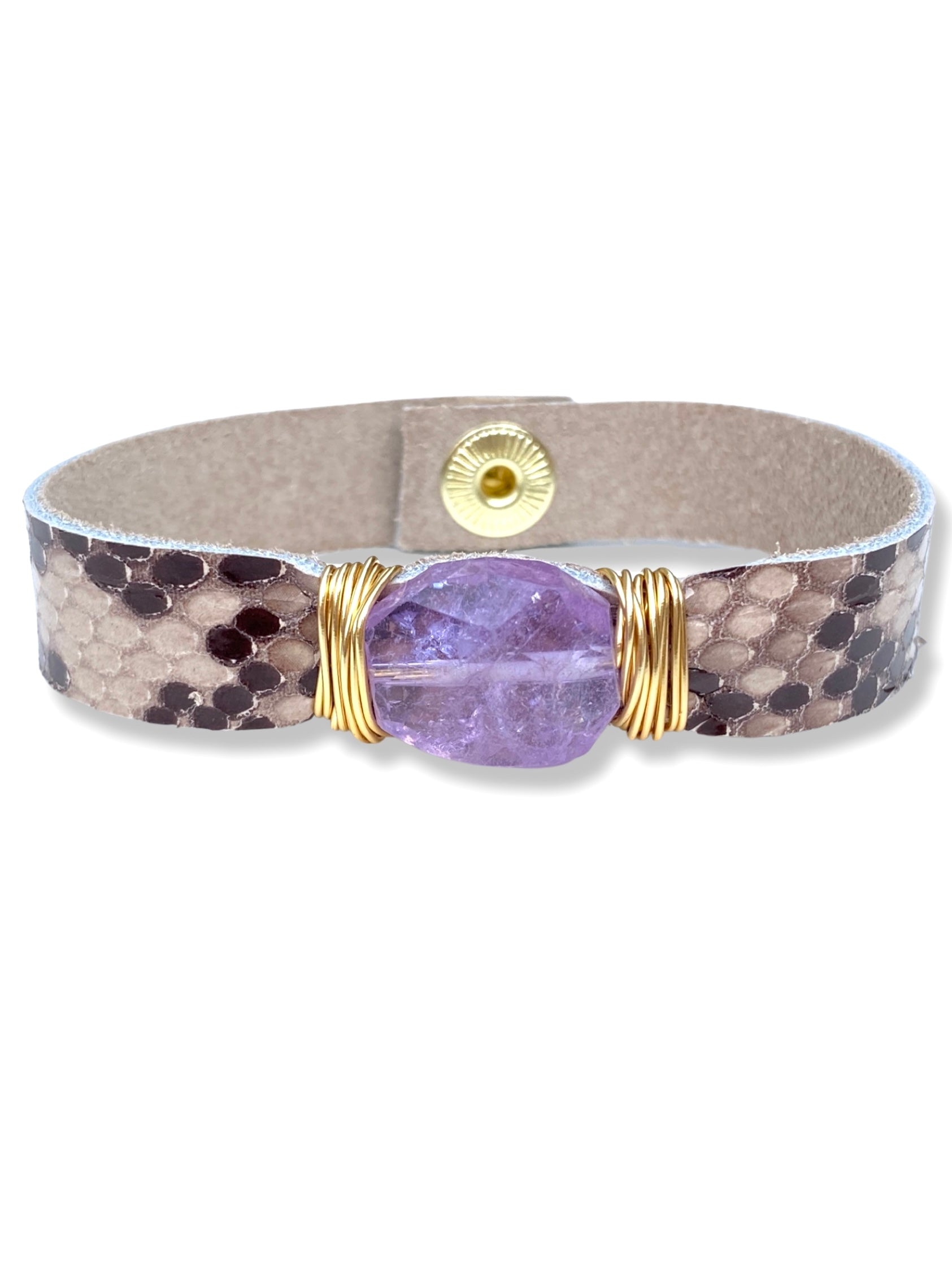 Amethyst wrapped onto faux python leather with a snap fastener.