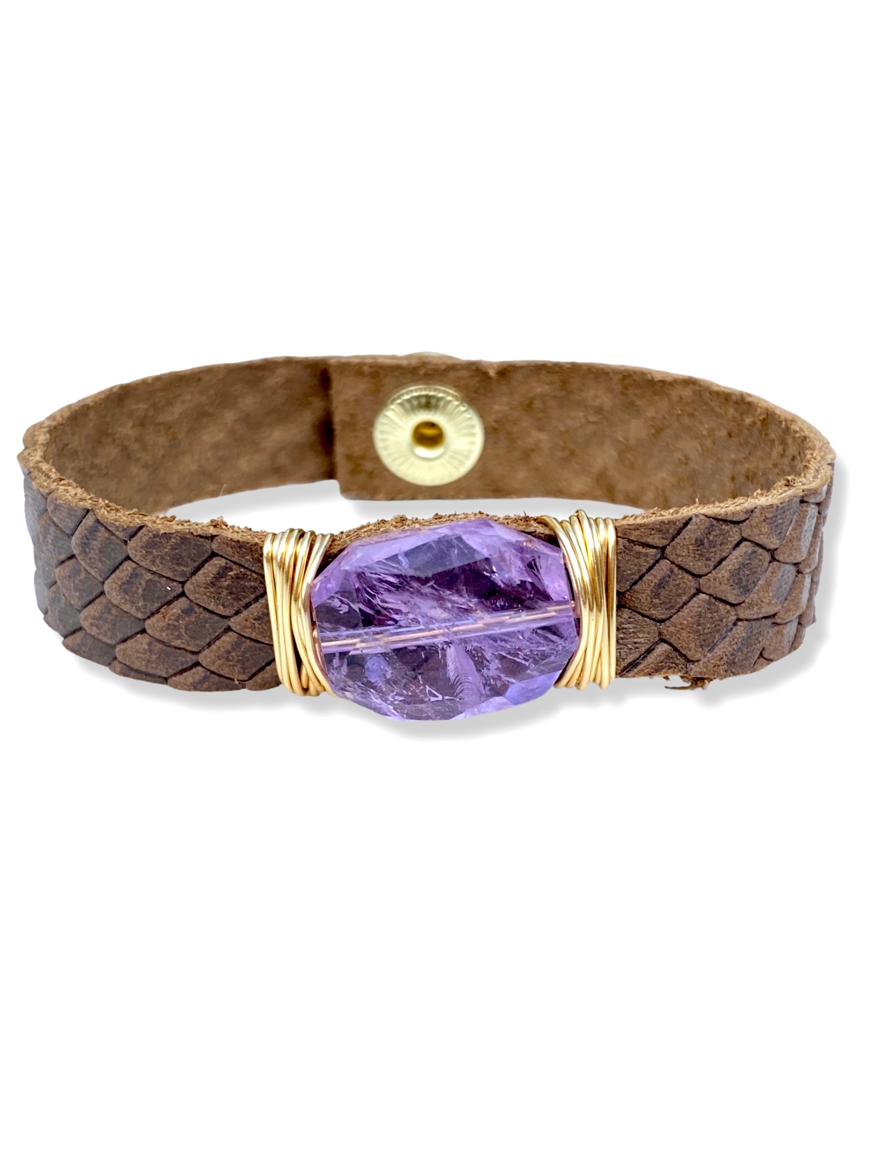 Amethyst wrapped onto snake skin embossed leather with a snap fastener.