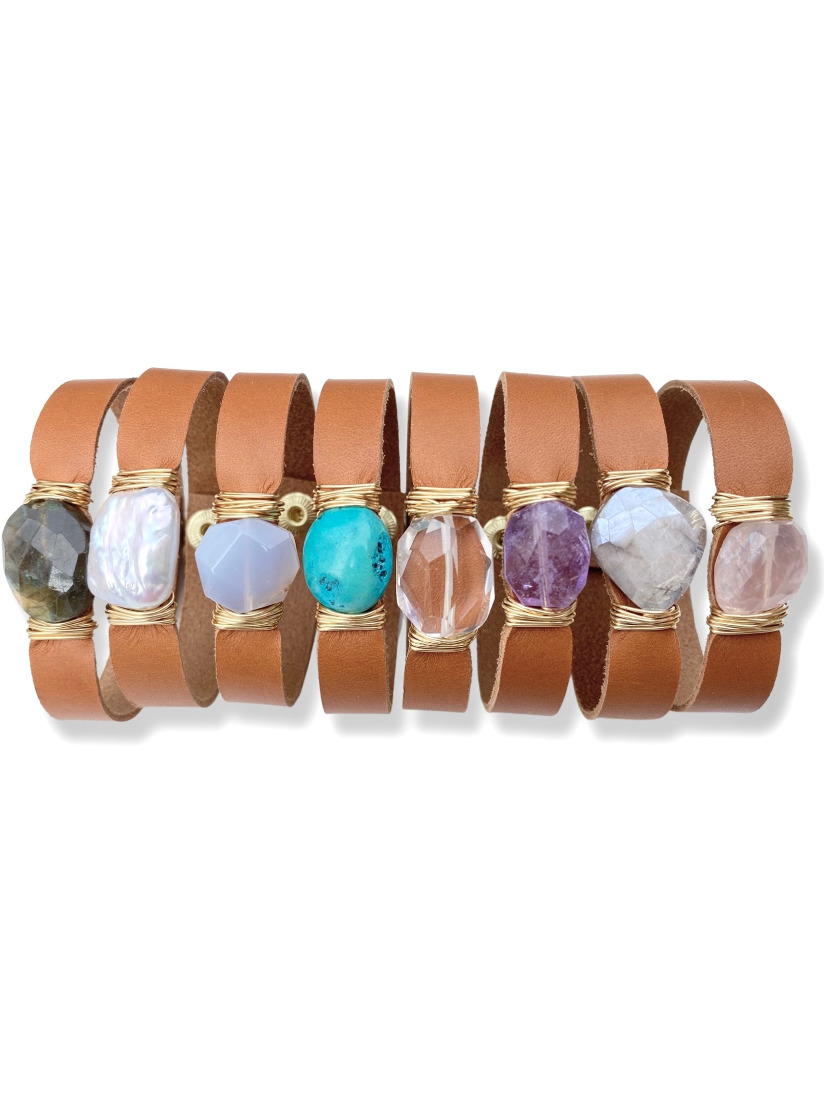 Amethyst wrapped onto saddle tan leather with a snap fastener.