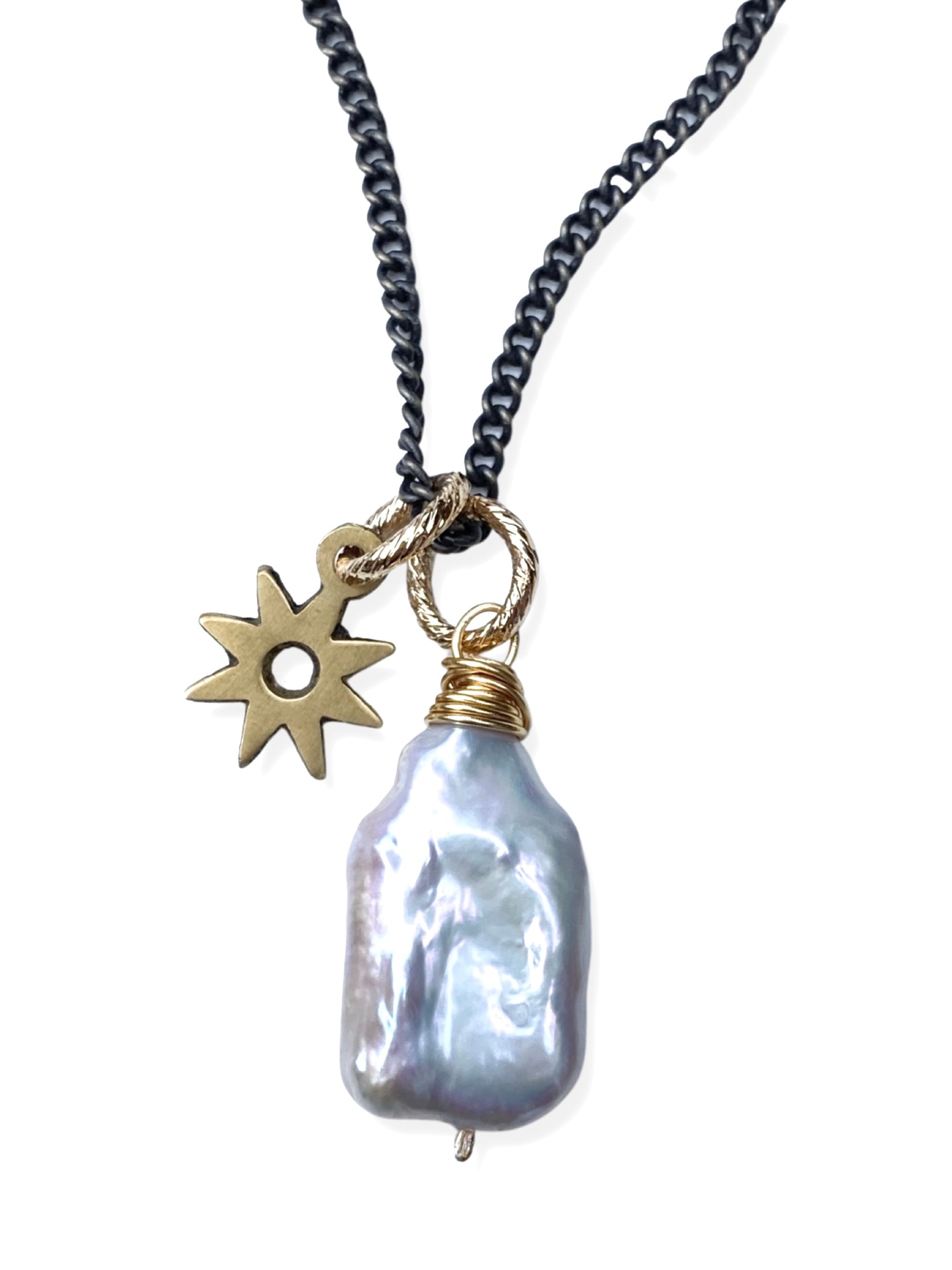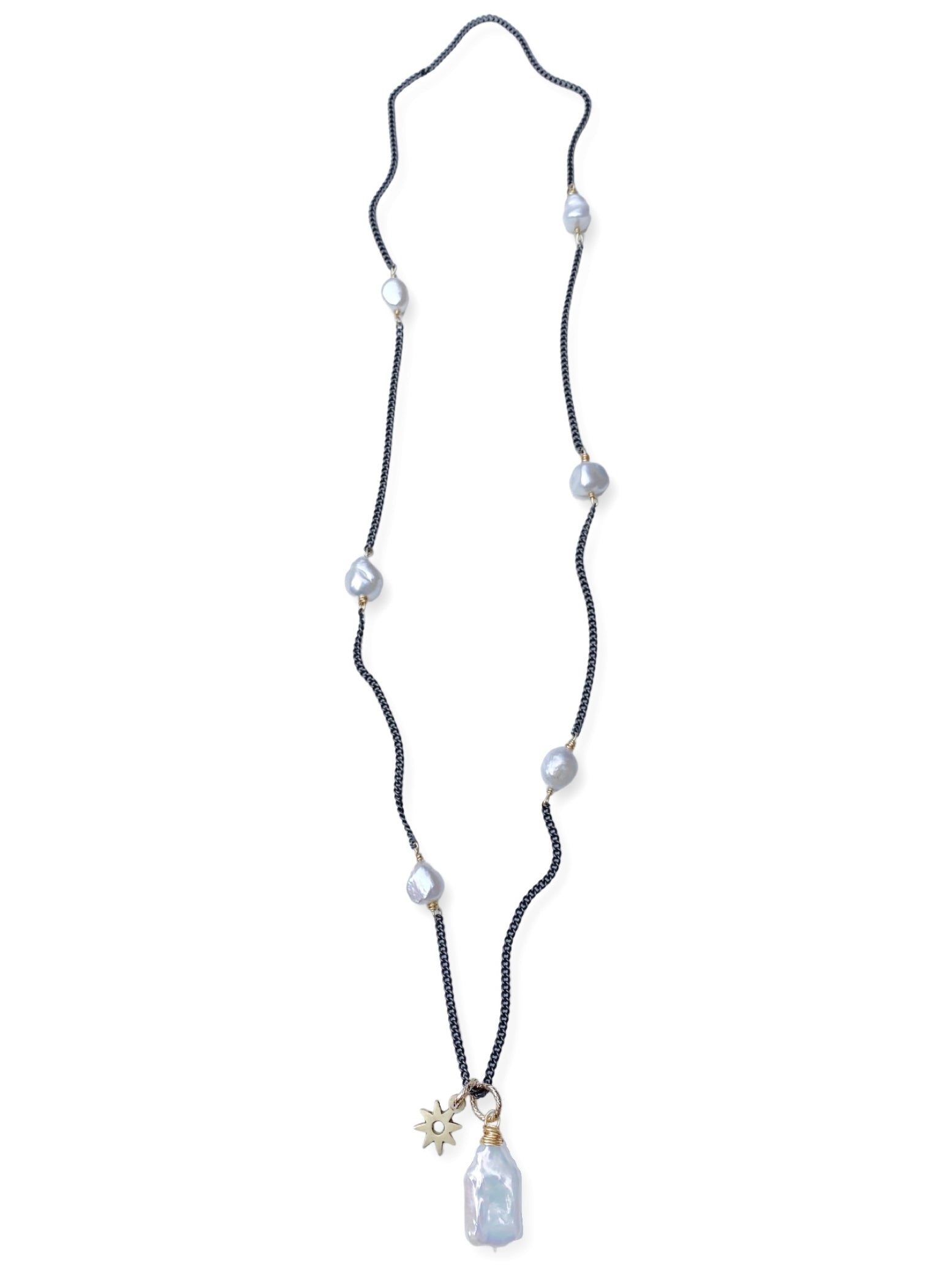 Antique brass chain mixed with freshwater pearls and a brass sun charm.