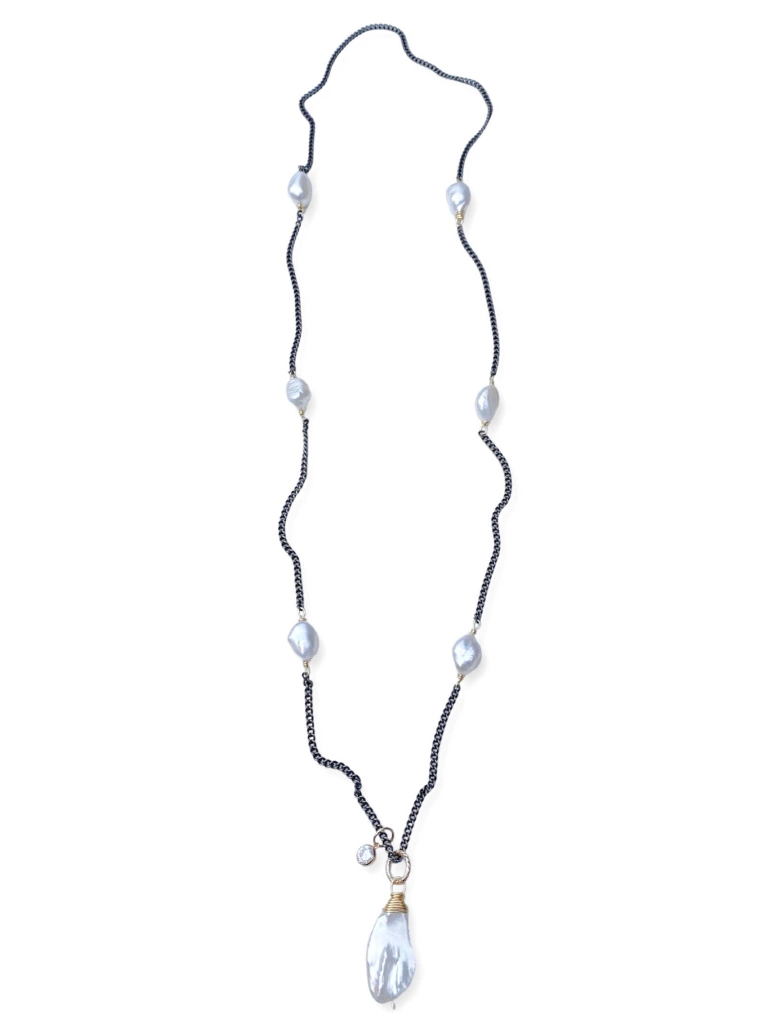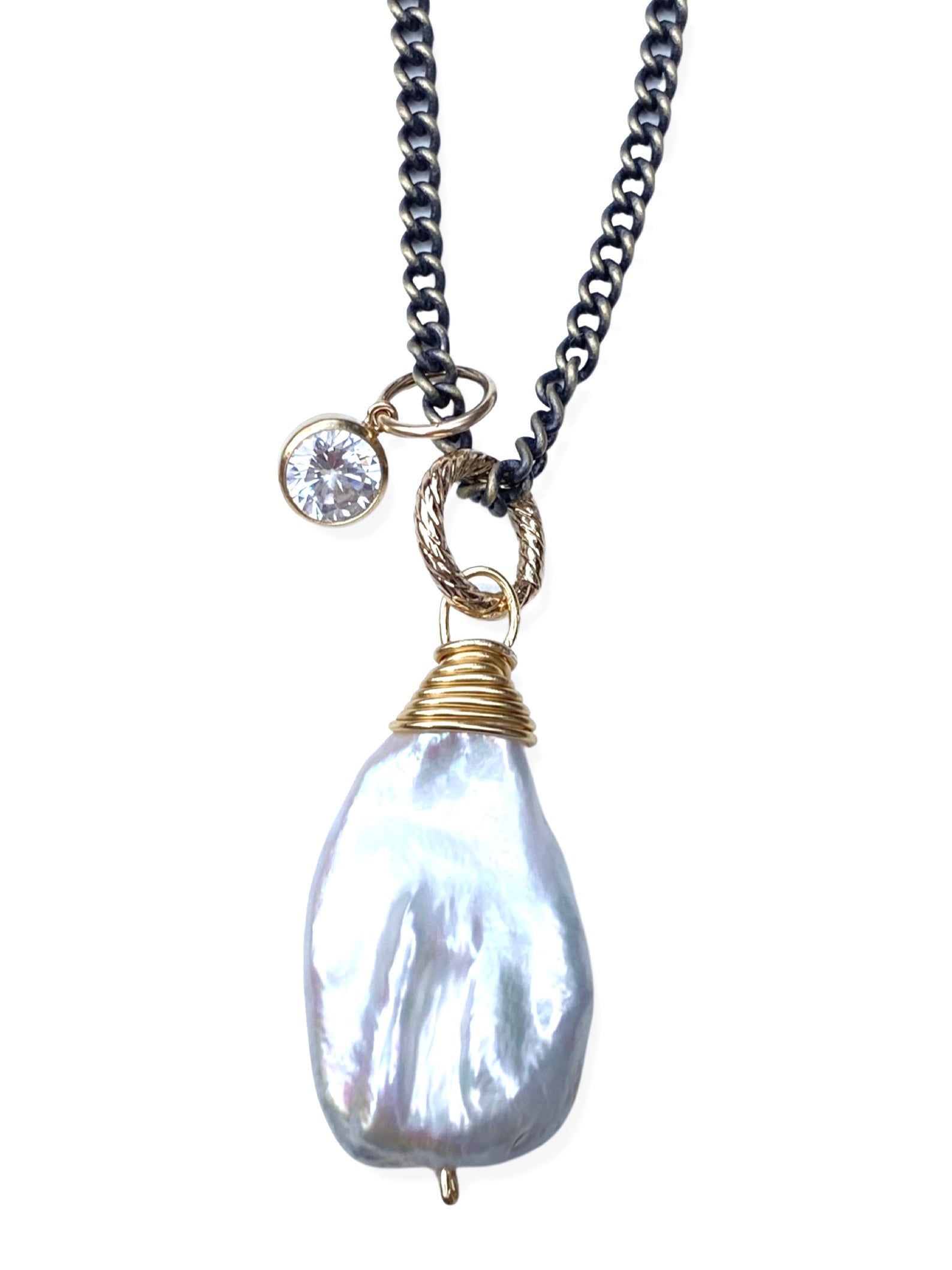 Antique brass chain mixed with freshwater pearls and a cubic zirconia charm.