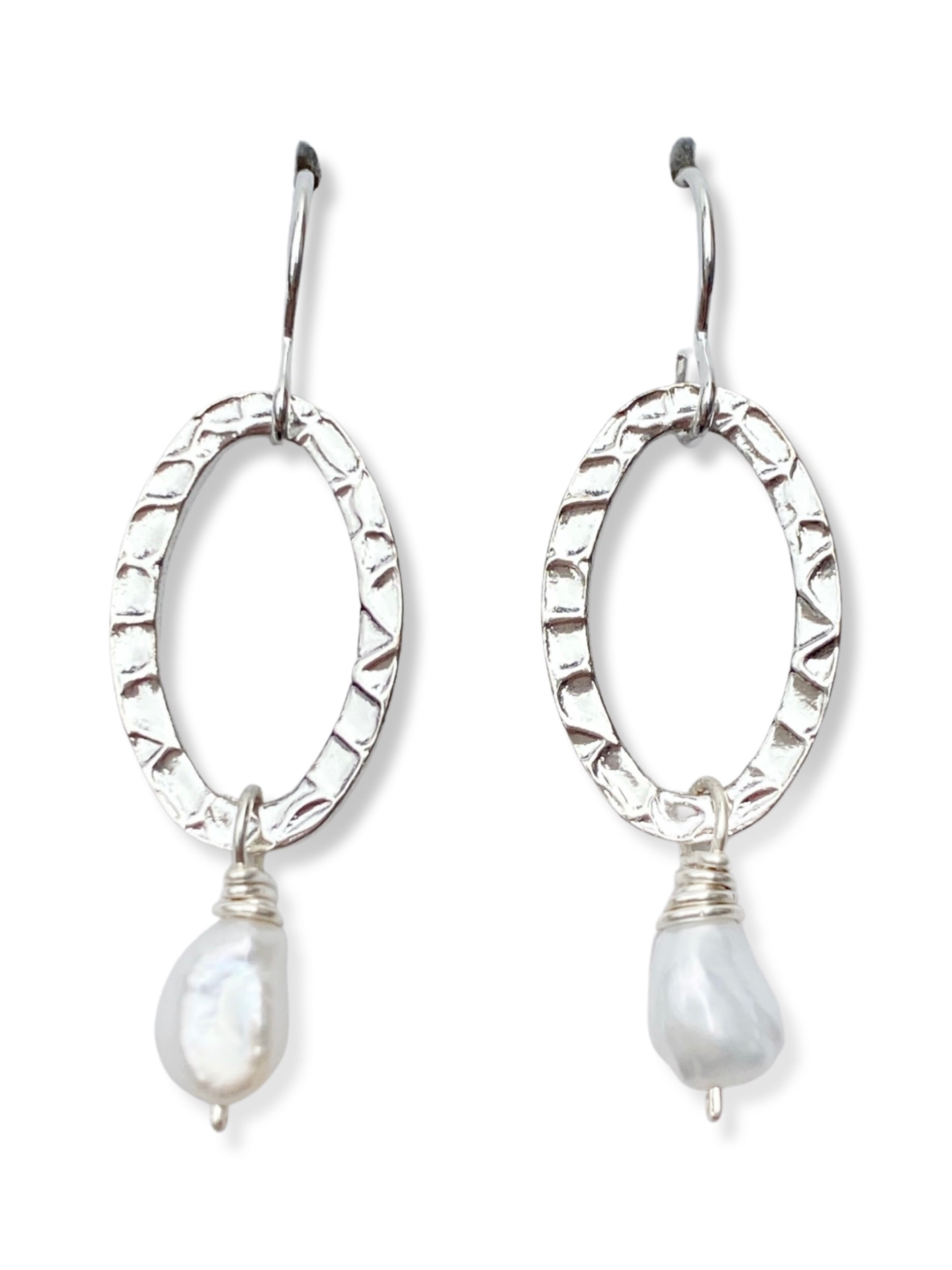 Silver plated, hammered ovals with a freshwater pearl detail.
